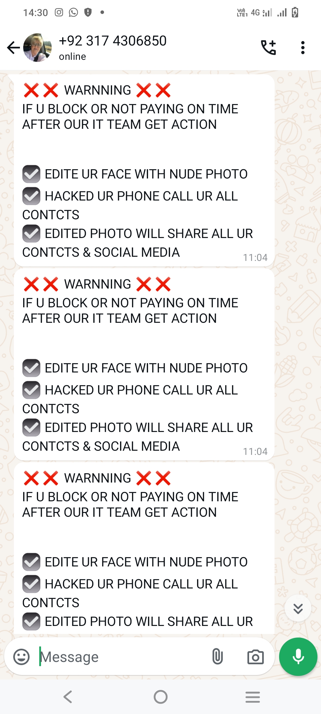 From morning I am getting many messages from someone whom I even don’t know and asking me to pay 2000 rs and they are sending me nude edit photos my contact details and my documents so request you to please look into this matter