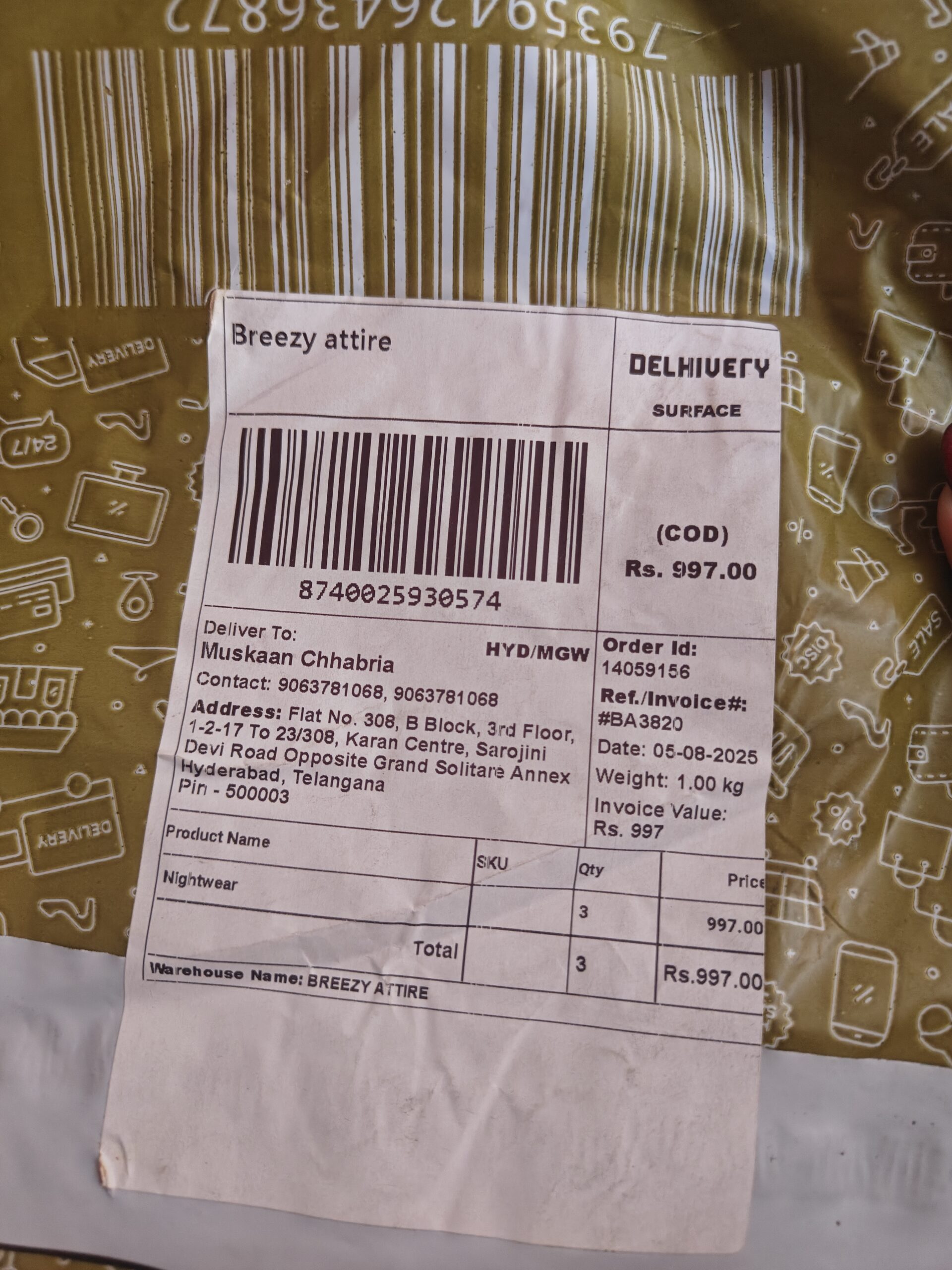 This was the website I had ordered night suit combo of 3 received this plain black t shirt and pants paid 997