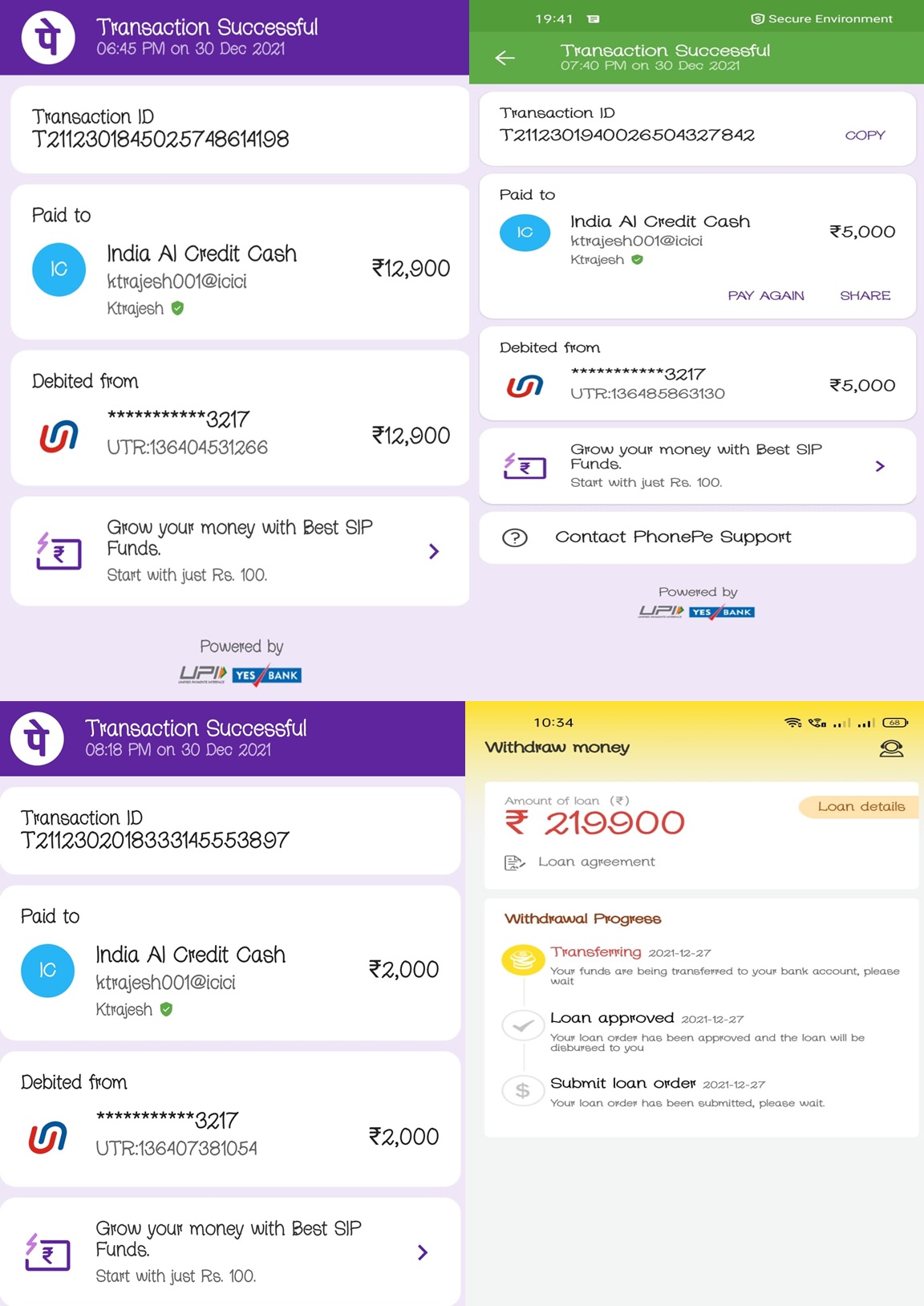 Due to emergency I applied for loan through “India AI Credit Cash Loan” app which is available in Google Play Store. Loan of 200000 sanctioned, but they ask for 5% to approve Rs.10000 and membership fee of Rs.2900. After payment of amount, they altered the account number and ask for unfreeze of loan account charges of 20% of loan. Again made payment of Rs.5000 towards it and then ask for risk authentication charges of Rs.2000 to disburse loan amount. Finally, everything paid but afterwards no response from them either through WhatsApp or Mobile or Mail.