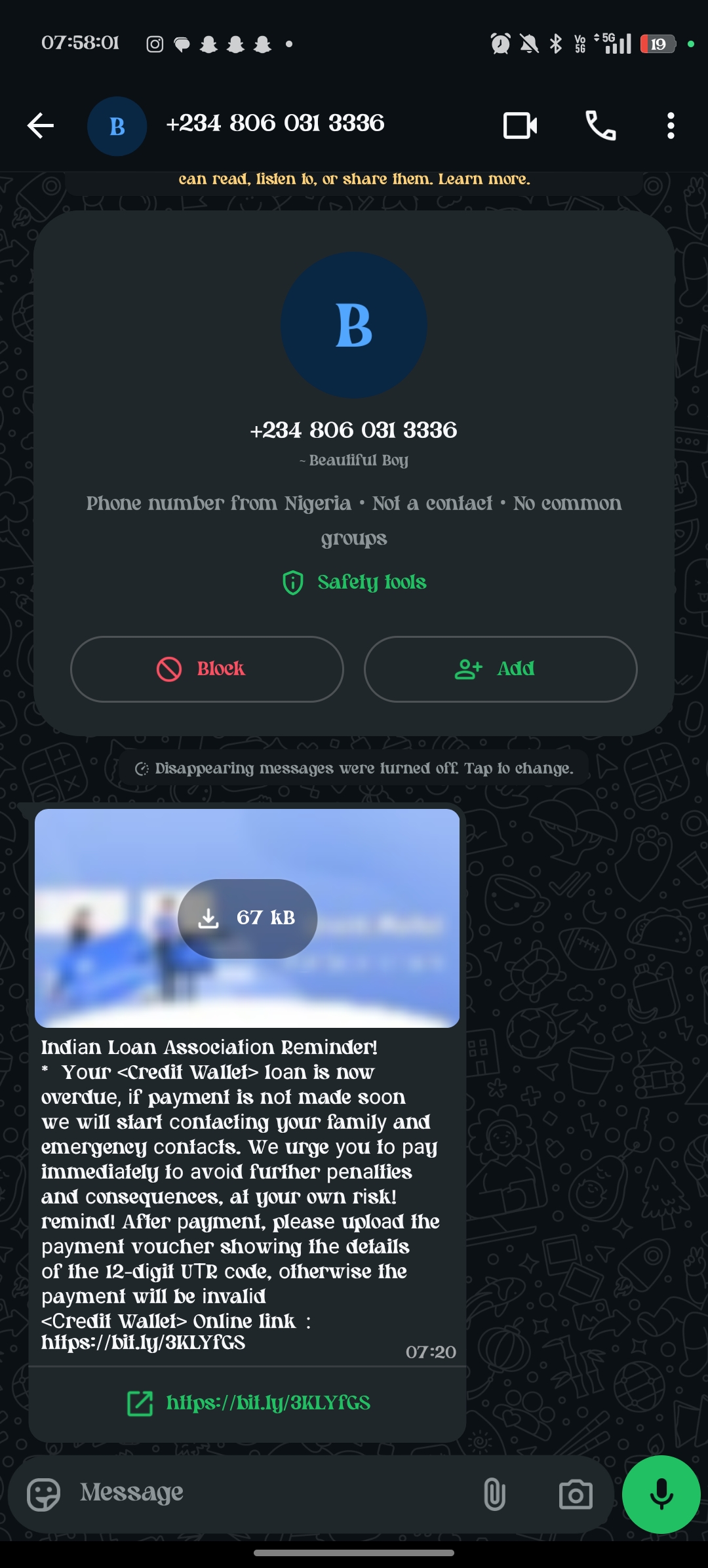 do din se mere paas roj indian loan association ke taraf se other country ke number se msg aa rahe hai ki loan overdue ho gaya hai repayment karo barna aapki family se contact karunga yah bo jabki maine aisa koi bhi loan nahi liya hai aur na hi mere account me aisa koi bhi amount credit hua hai