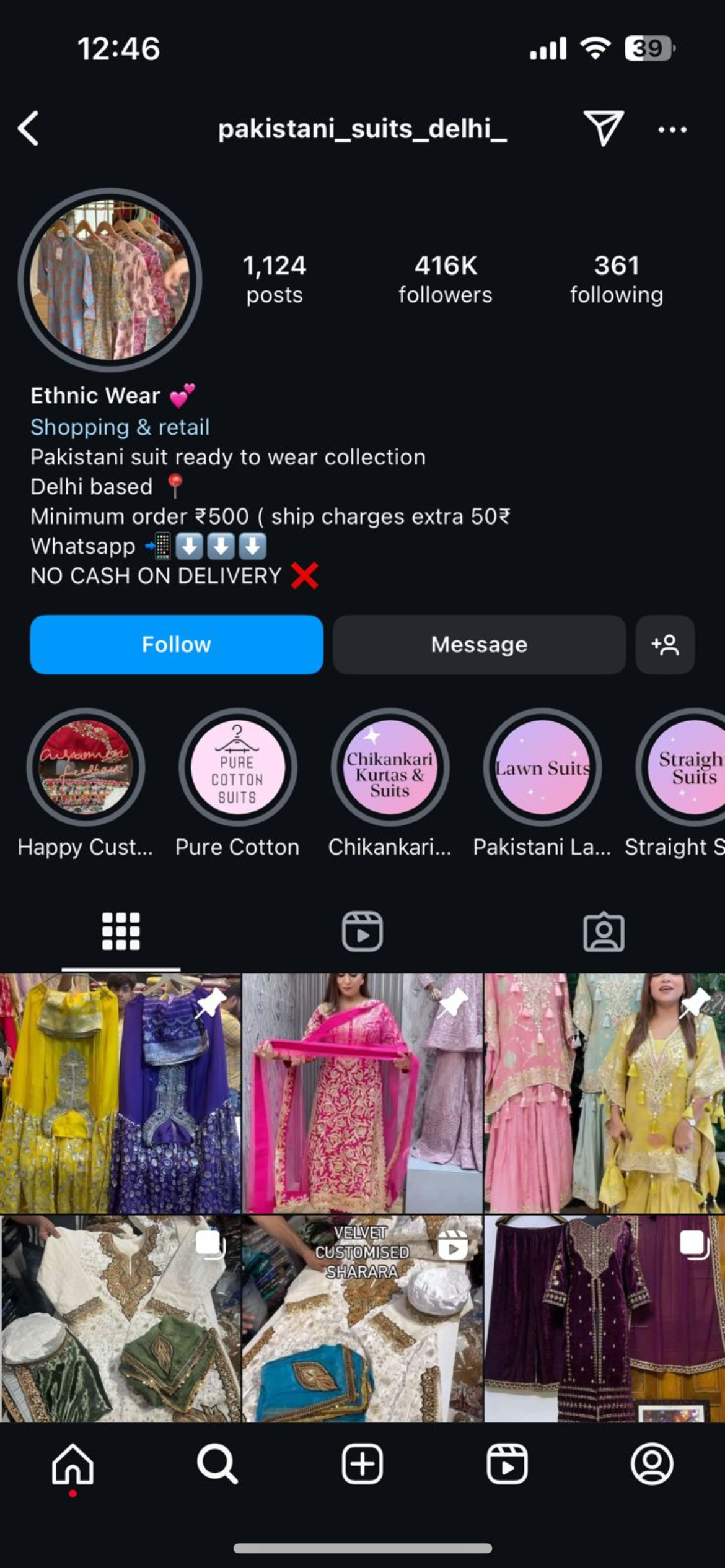 I ordered a suit from instagram page named PAKISTANI_SUITS_DELHI their name earlier was BLISS STORE 786 but thdy changed because many people complained about them.