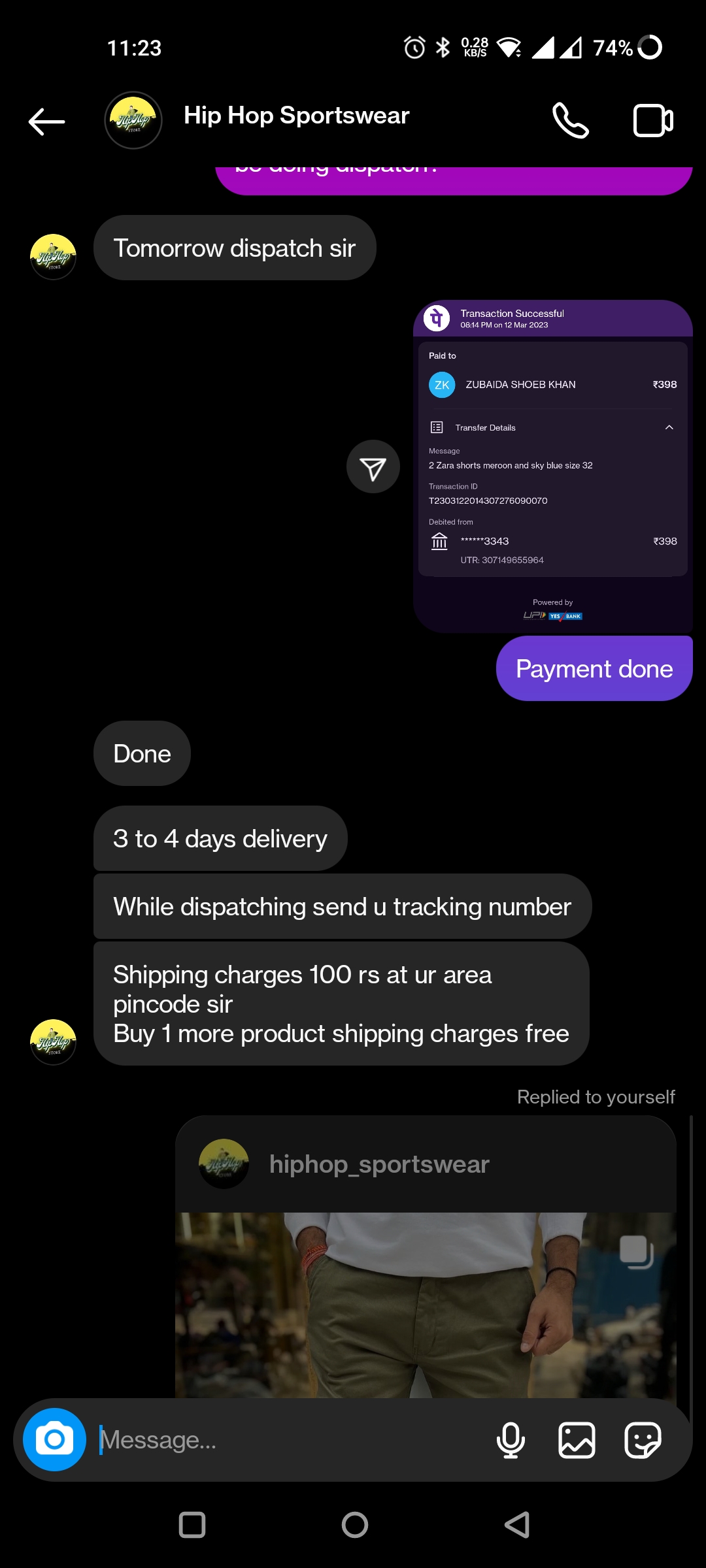 Complaint against Instagram seller https://www.instagram.com/hiphop_sportswear/. Ordered sportswear for 698rs on Mar 12th but after payment I have got no response from the seller and also no courier details. Tried to contact multiple times but got no reply.
