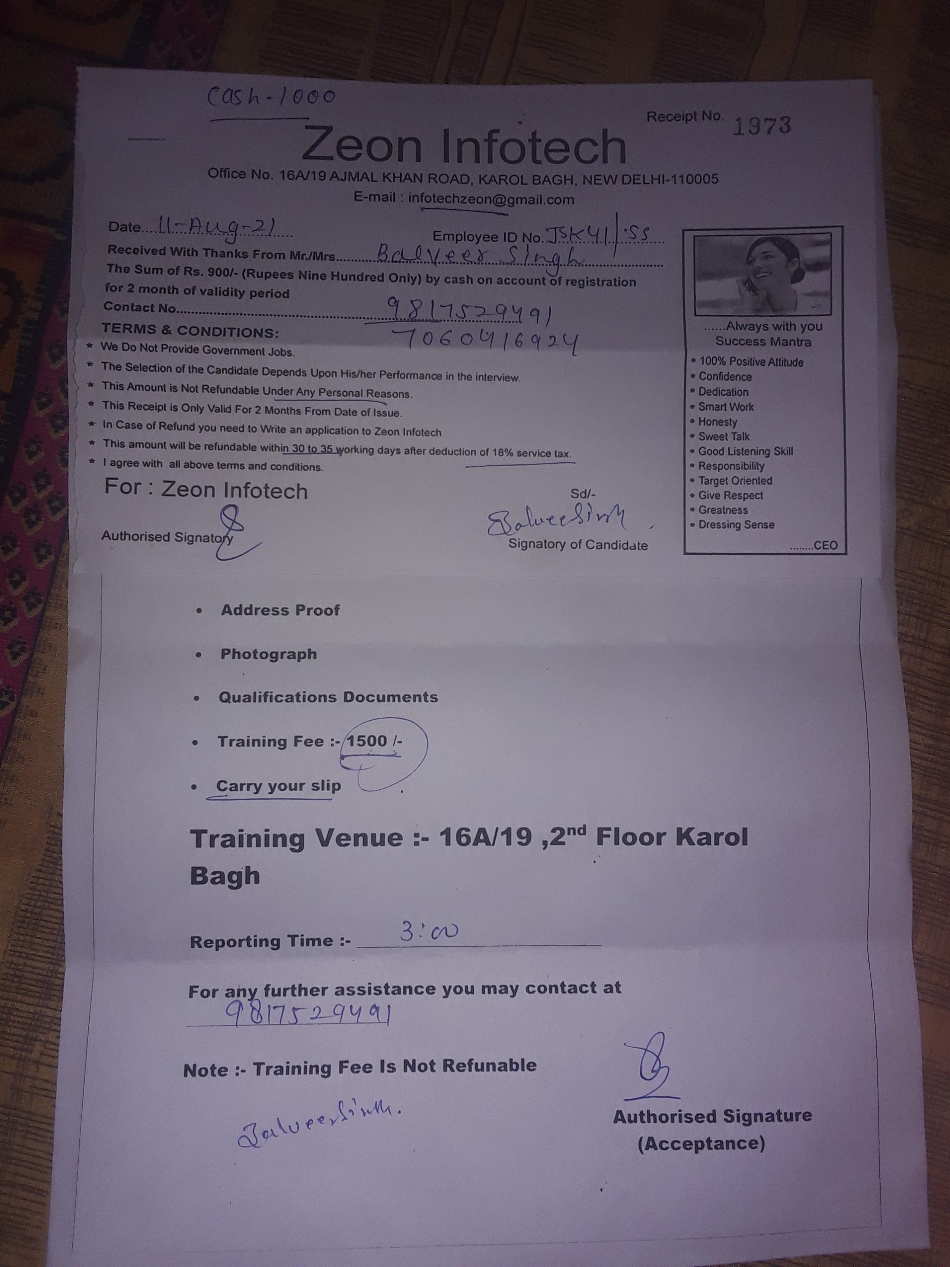 11/Aug/2021 ko Interview mai 1000 rupe and aadhar card ki copy and photo liye. Phir 14/Aug/ 2021 ko training ke liye 1500 rupe ki mang ki.