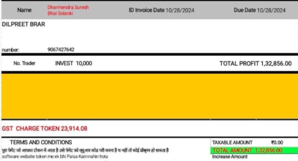 He asked for investment of Rs. 10000 and profit will be 132000 , after that a have paid that rupees any how and he tell me to pay GST for payment release of Rs. 132000 a had also paid it by selling my wife mangalsutra in hope payment will be released but after that he call me and asked for another 19999 as a withdrawal charges and when I asked him and bagged him for release payment or only return my payment and keep you all money he tell me we r not legal in India so out country se paisa release karna hai to withdraw charges Dena padega now I m helpless and filled guilty. He provide me UPI nares70238489@barodampay . I had paid 34000 thousand on this id my payment proof attached herewith as image and also they provide earning proof of 132000 to give me jise dekhne ke bad mai convince hua tha payment karne ko
