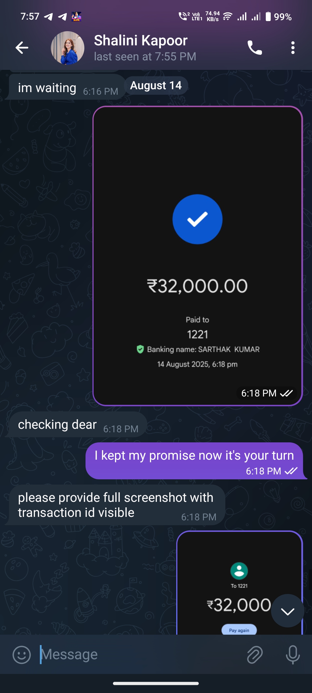 I have seen to many ads for shalini kapoor investment plan so I have to decide to send 8990 rs. To her given account after 3 hours she said you got lucky and you got big prize but their is a issue when I said what issue with that money so she said their was a 13% verification charge to pay to verify your account to confirm you are the real person which account was selected to release the money. So I am decided to send verification ammount,it was 20724.24 and I send to her 20724.24 Than sometime she message me their was a mistake to the payment you are sending 20724.24 you are supposed to send only200724 about that i was crying please refund my money i am not able to send money again but she didn’t recognise it, she was said your money is not going anywhere your money was stuck by wrong payment and this money goes to add profitable ammount and your withdrawal verification ammount is 23452 only one times after 2 minutes the whole money 203854rs. Credited to your account. So i have sent that also then after by showing various reasons she took 36683 and 32000 and now asking another 38720 to release the amount