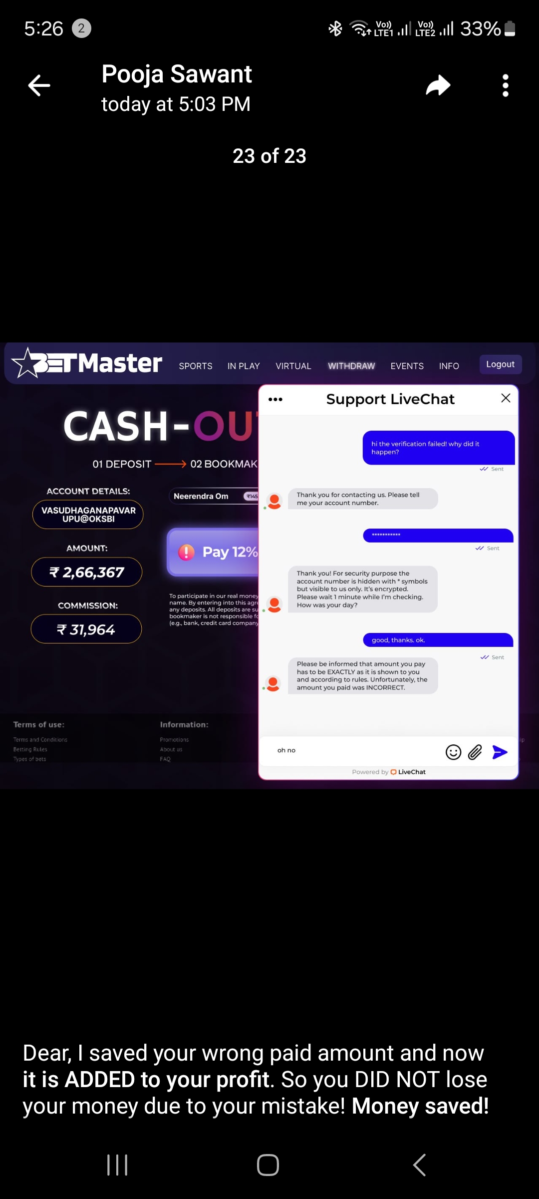 To receive the profit, she asked me to pay Rs.26,396 amount as 11% commission charges to withdraw money from BetMaster.