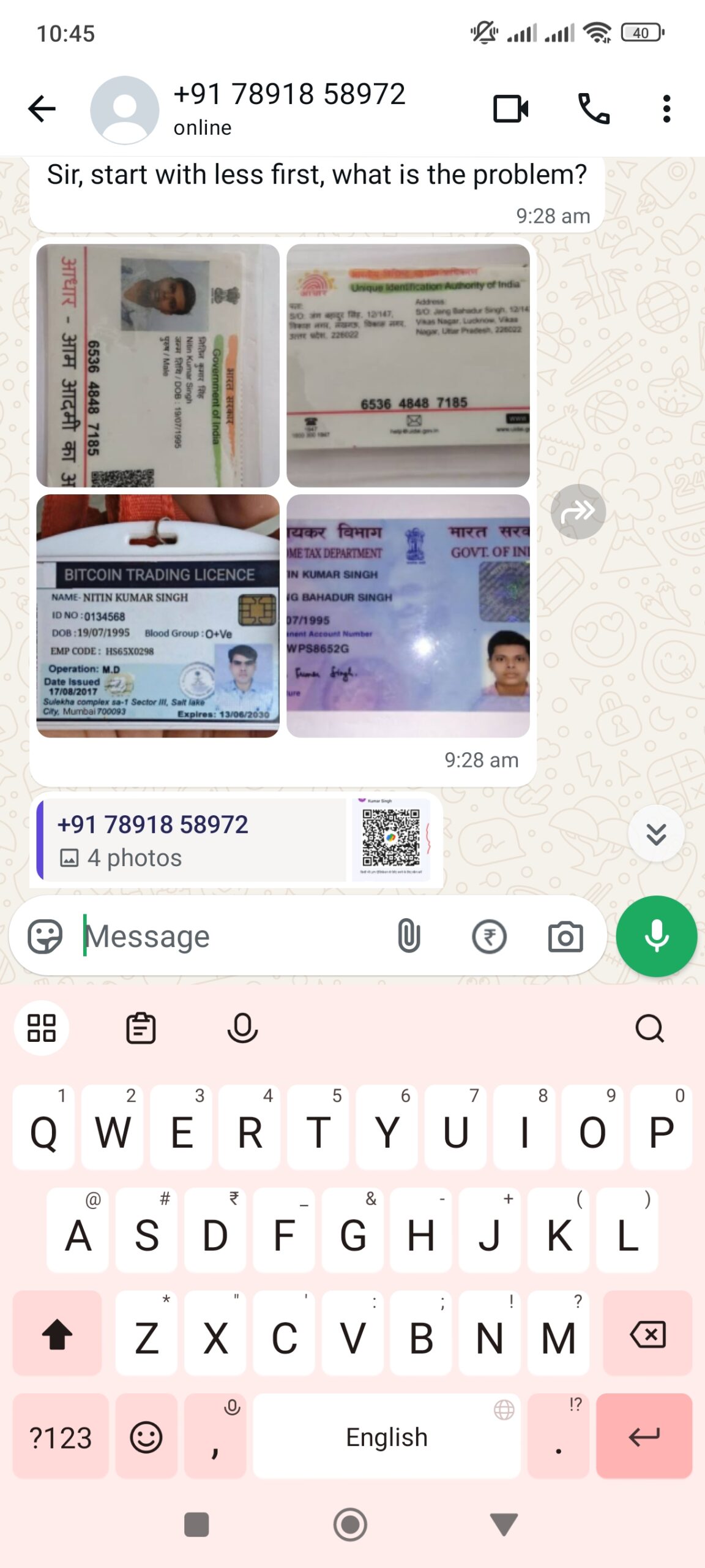 I have invested 45 thousand for Bitcoin trading and he provided faked documents as Nitin Kumar Sing and not giving the money back