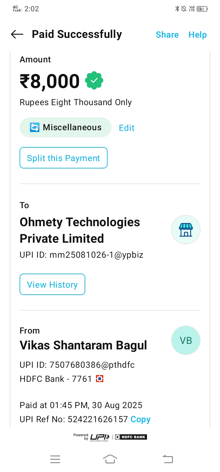 I recharged Rs 8,000 on the 30th at 1:45 pm. That recharge is ohmety technologies private limited His UP ID mm25081026-1@ypbiz This is and its UPI reference number is 524221626157 and its order ID number is 72350874111746This is today the 30th, it is 8:46 am. I still haven’t received my money. I request you to send me my money as soon as possible. I really need the money. I have a screenshot of it. I will send it to you.It’s been 24 hours since you told me and I still haven’t received my money. I want my money now.