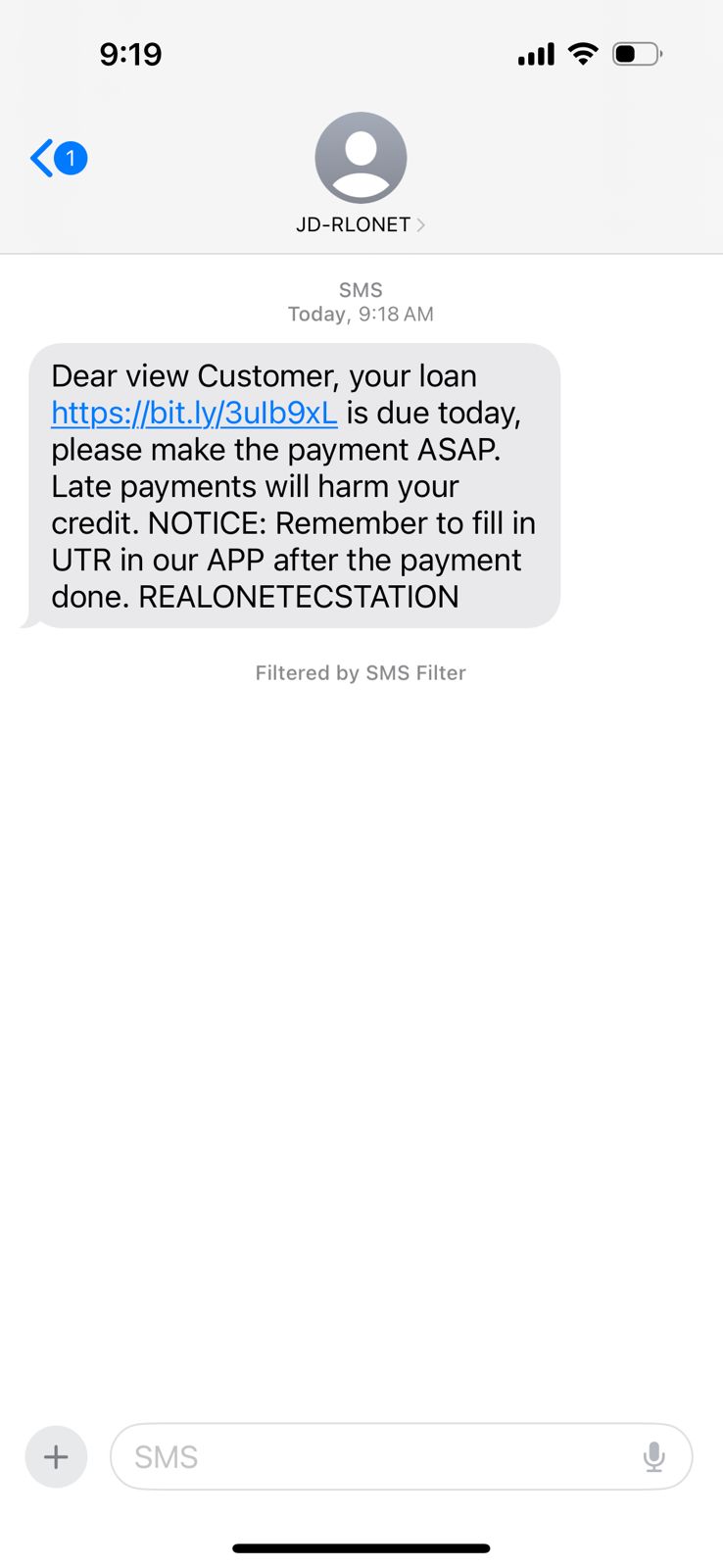 Dear view Customer, your loan https://bit.ly/3uIb9xL is due today, please make the payment ASAP. Late payments will harm your credit. NOTICE: Remember to fill in UTR in our APP after the payment done. REALoanTECSTATION