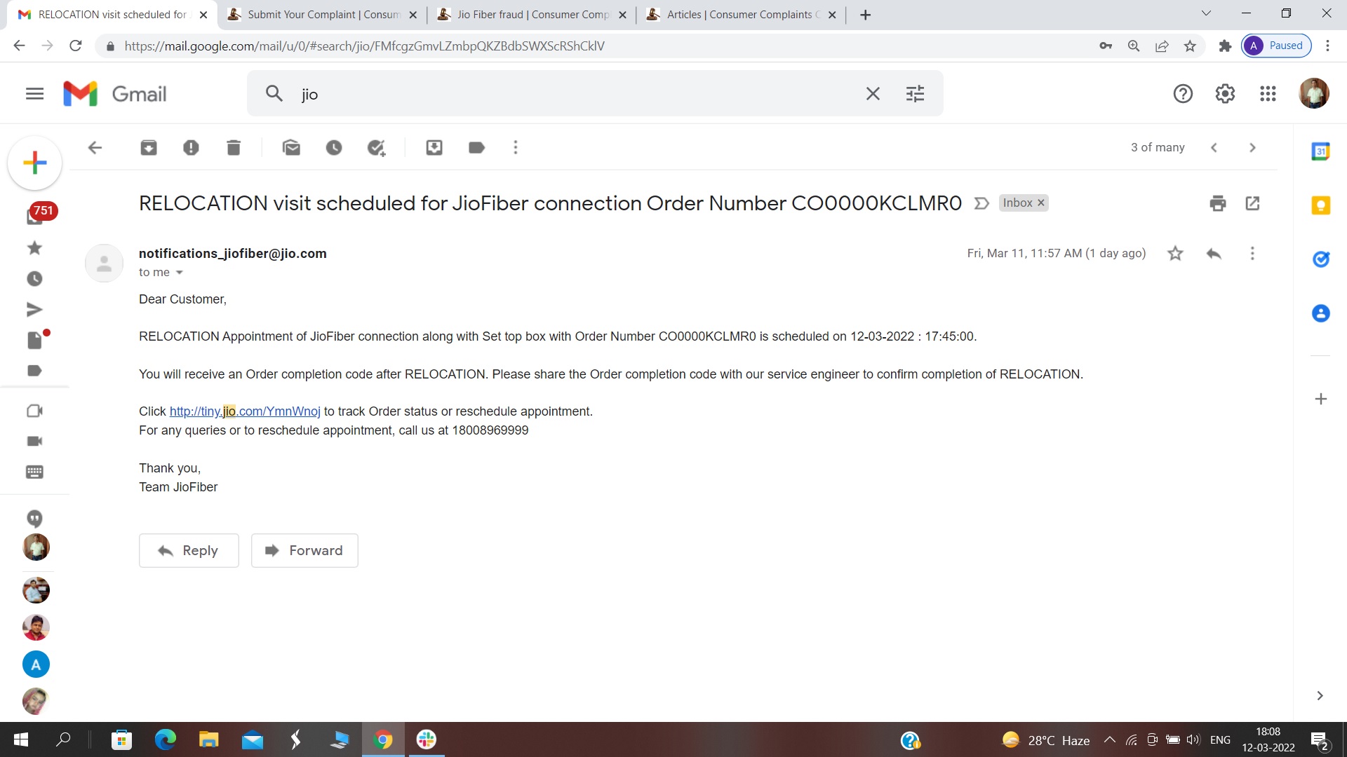 I am using Jio fiber connection from last two years. Now I changed my home so I requested them to reallocate my connection on new location. I called them before recharge because I was not sure that they will reallocate or not but they said recharge now and it will be reallocate in two days. I recharged my connection plan on 8th of march 2022 and requested for reallocation on 9th march 2022, I got a message and they scheduled it on 10th march 2022 on 5:30pm but on 10th march 2022 I received a sms from their side that your request cancelled due to address verification. I called their customer care and they could not provide any satisfactory response. After that on 11th march 2022, again I generate a request for the reallocation and I received a sms from their side that it will be done by 12th march 2022. But I have not received any call from their side and no engineer visit regarding this. I am an IT professional and doing work from home so internet is the primary thing for me. I paid them because I don’t want any delays in internet use but think those guys are not serious about this. If I am not using their services from past 3-4 days then who will pay to me. I want to reallocate my connection without delays and compensate about i am not using services after payment as well. Please look into this and it will be great help for me.