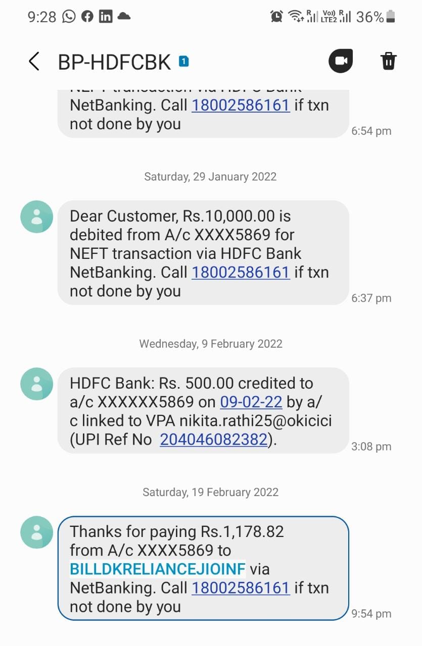 Thanks for paying Rs.1,178.82 from A/c XXXX5869 to BILLDKRELIANCEJIOINF via NetBanking. Call 18002586161 if txn not done by you