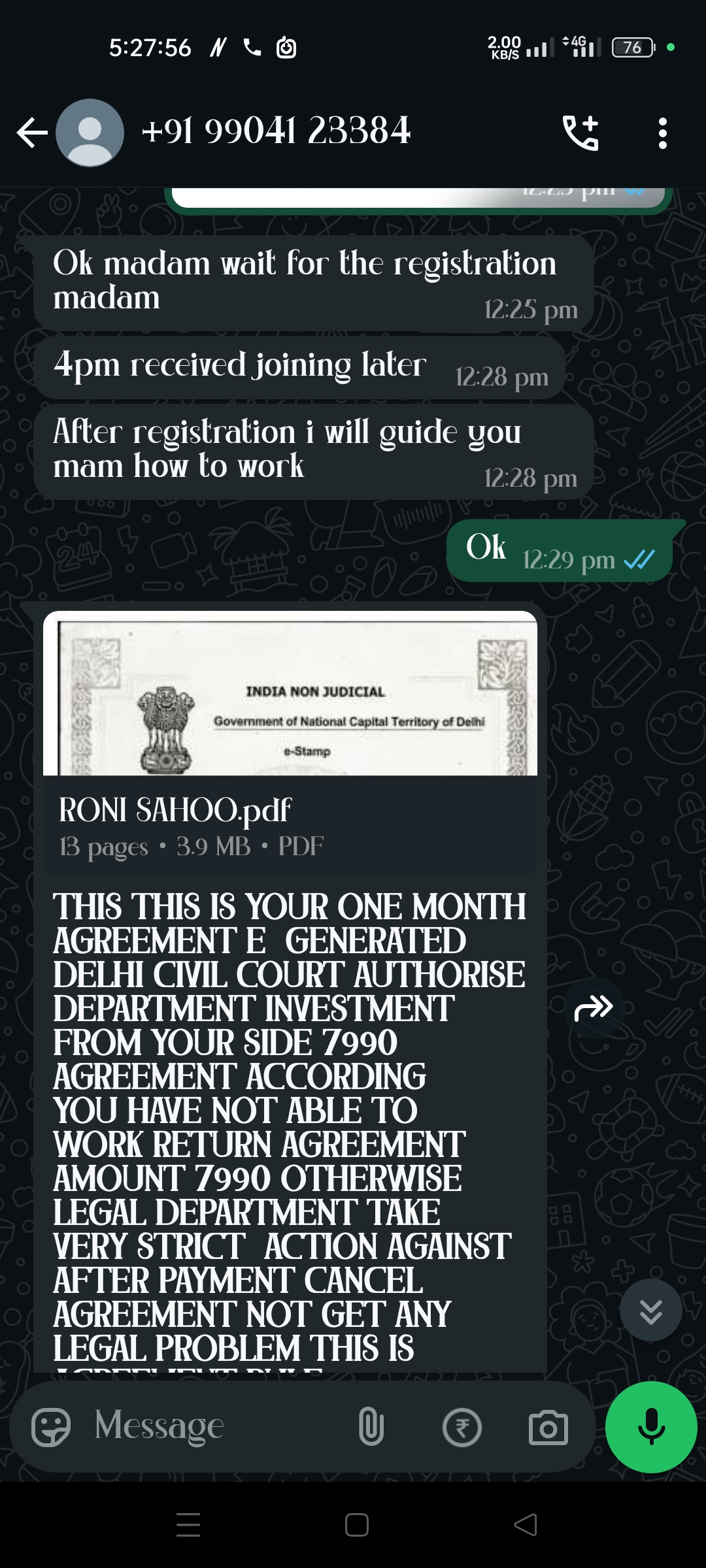 A guy named came to me regarding work from home job through WhatsApp. In the interest, I replied him that I’m interested to work and he asked me if I have adhar card and to send front and back and a name on a white paper and passport size photo. I sent him as he said blindly thought it is genuine. Later he told me that he is going to send male “JOINING LETTER” but he sent me “AGREEMENT” without any intimation and he only by himself kept my sign and all details in that agreement. Later told “it is an agreement with court and if you want to terminate by now only tell me now, otherwise you have to face consequences. “And he asked me to pay 7990 and will resend them back to me. If I not pay them, they are threatening me with calls and messages and with appropriate behaviour and words. It is a cybercrime for sure. Please take action against them sir/madam. I am attaching the chatscript below.