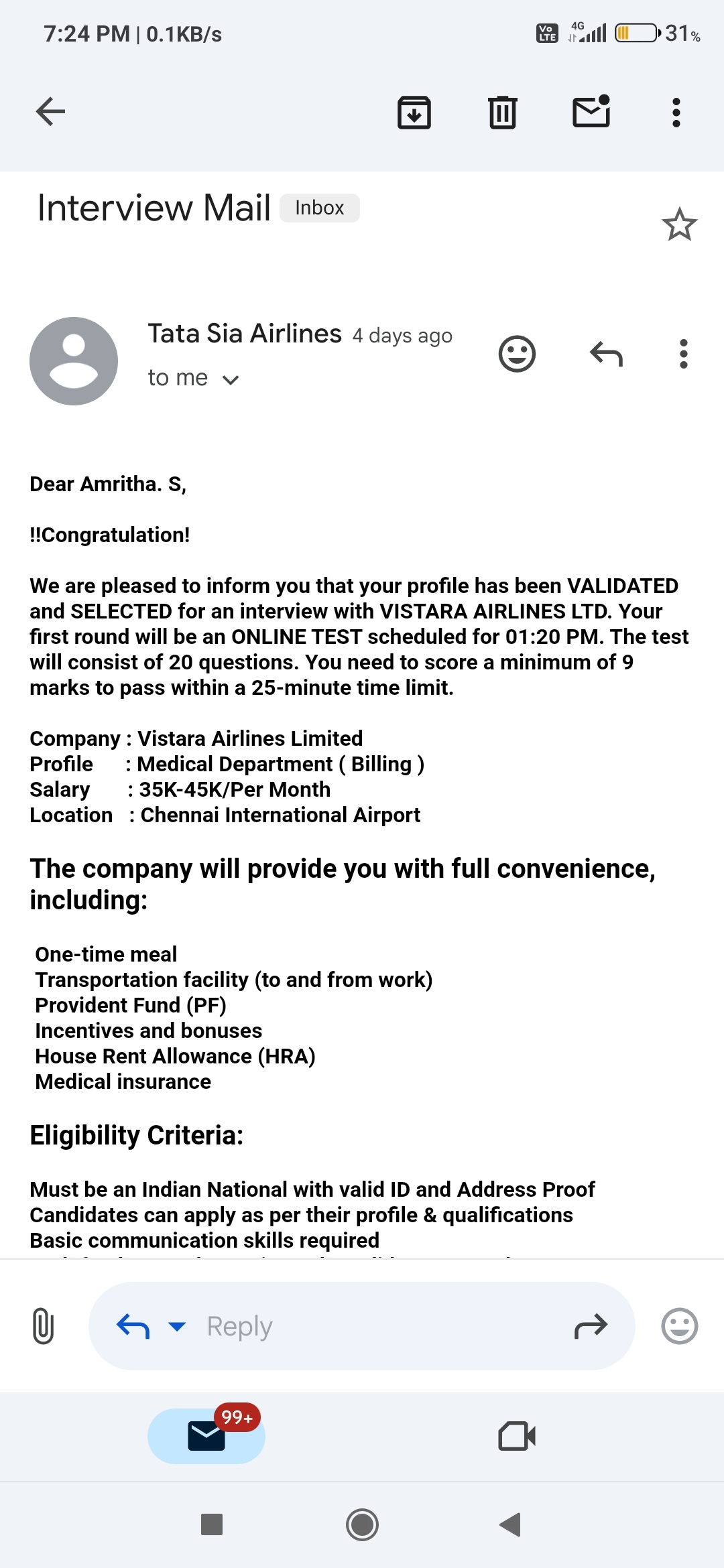 She called me up and pressurised and forced me to send me to take test, and again forced me to pay 2000 rupees. And I paid, and attended the online test When I asked about job description, she did not give correct answer, she said senior HR manager will give details.