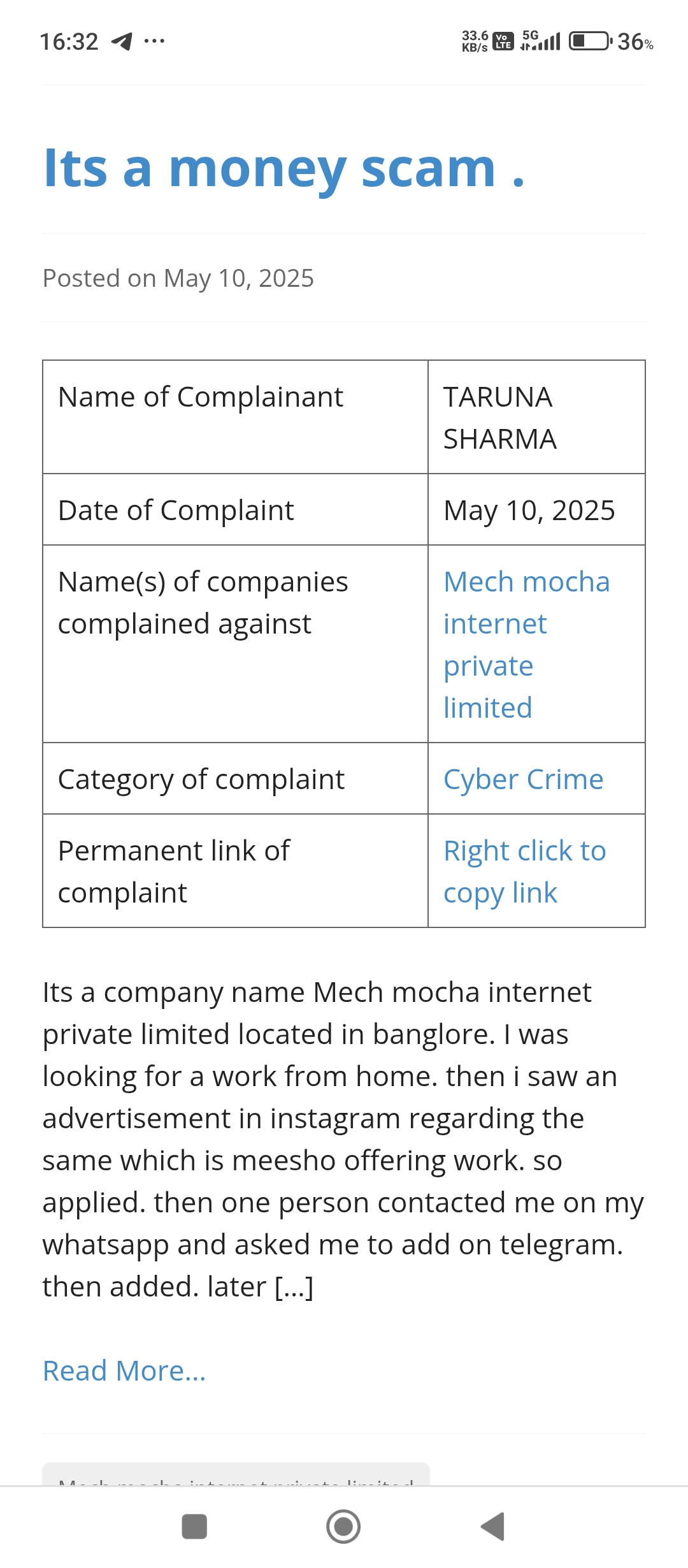 | Name(s) of companies complained against | Mech Mocha Internet Pvt Ltd |