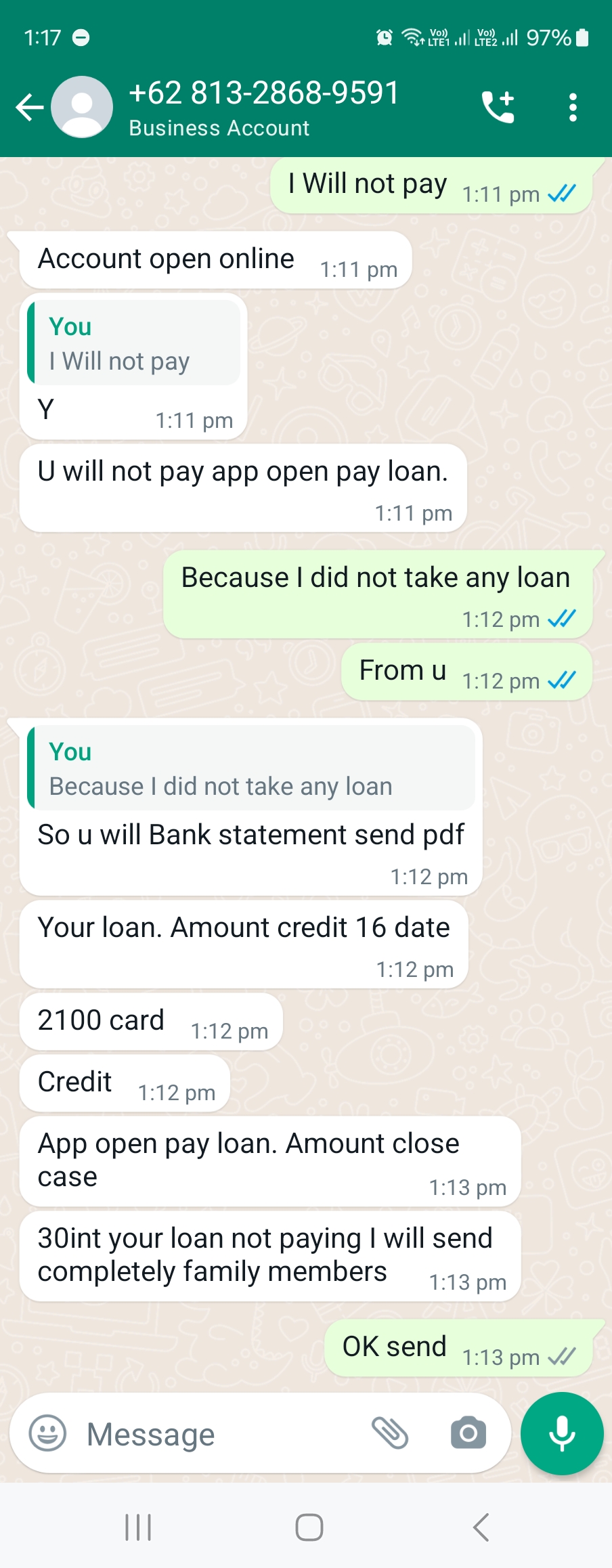 I got a message saying they sent me Loan amount 2100 on 16/1 , now I have to pay 3100 or they will threaten by sending all my family members..