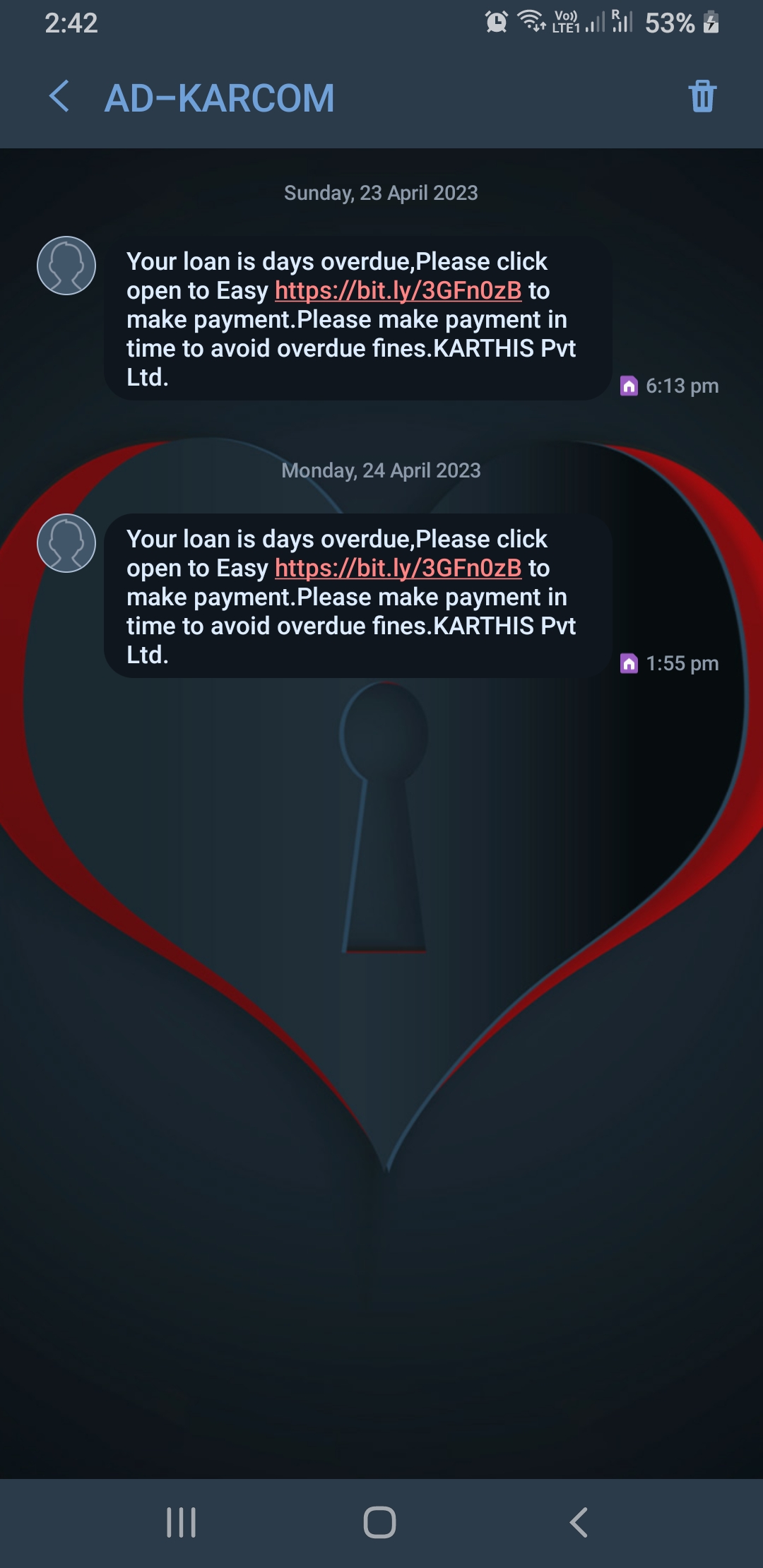 I’m getting random SMS’s and whatsapp messages from this so called company Karthis E-Commerce Pvt Ltd. They are threatening and harassing me to pay the amount .which I haven’t received any money as such. Please help me out from this disturbance and I’m getting messages that they will call up my contacts and family members.