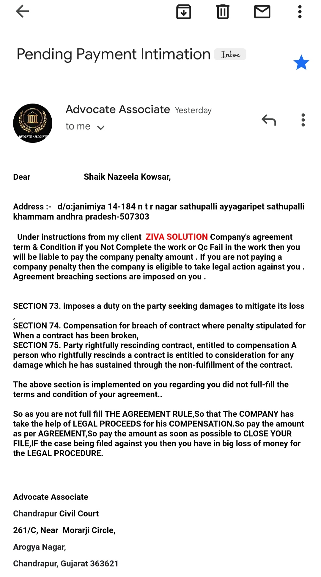 My name is Kowsar and I want to complaint against Ziva Solution. I was contacted from ziva Solution by a man asking if i want to do a form filling job. I also said him yes, the job was to complete 800 forms in 7days. If it is 80% accuracy, then they will make pay me RS.24000 and will deduct Rs.5100 from it as there fees.But if not completed, i have to pay them Rs.5100 as penalty. I have start the work in 18 september 2022 and Submit the work in 25 september 2022but QC report failed . They didn’t said you have to pay the penalty amount. Today i got a mail from Advocate Vishal Sharma, Advocate Associate, chandrapur cibil court, 261/c,Near Morarji Circle, Arogya nagar, chandrapur Gujarat-363621.This is the Advocate details.This Advocate sent a mail to me.After he calls me ,he said that if i doesn’t pay the penalty ,he said that he will take legal actions against me.I am afraid of that, i have to pay Rs.9150 including penalty and legal charges.After that he said that Rs.40000 extra paid to him. Iam totally depressed ,i don’t have such amount ,i ask to him.After that