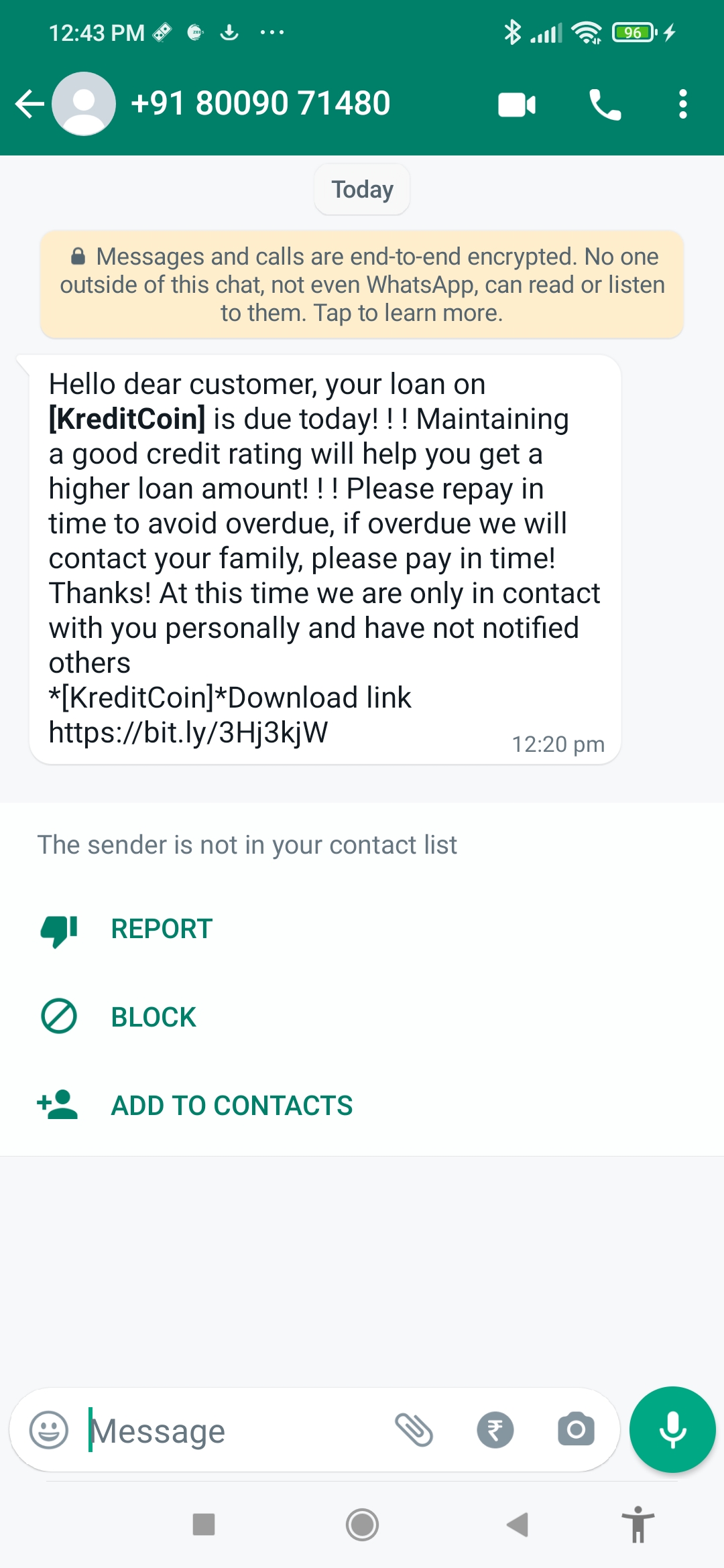 1. I have not taken the loan then also I am receiving like this messageHello dear customer, your loan on *[KreditCoin]* is due today! ! ! Maintaining a good credit rating will help you get a higher loan amount! ! ! Please repay in time to avoid overdue, if overdue we will contact your family, please pay in time! Thanks! At this time we are only in contact with you personally and have not notified others