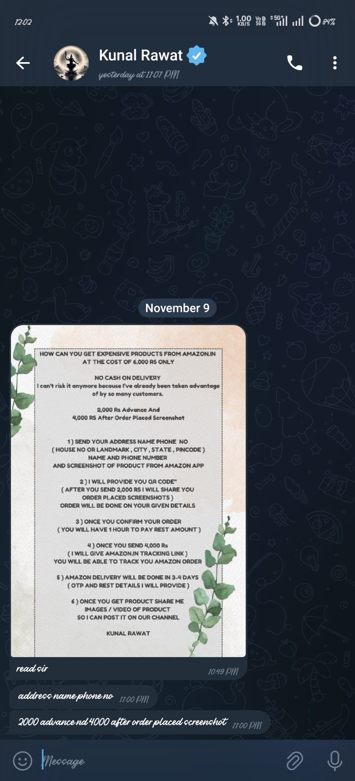 Telegram @Kunall_RRawat lures consumer with fake deals on telegram, he post photos which shows product got delivered from Amazon but no one received it there are many users who have fall for this scam and have been looted.