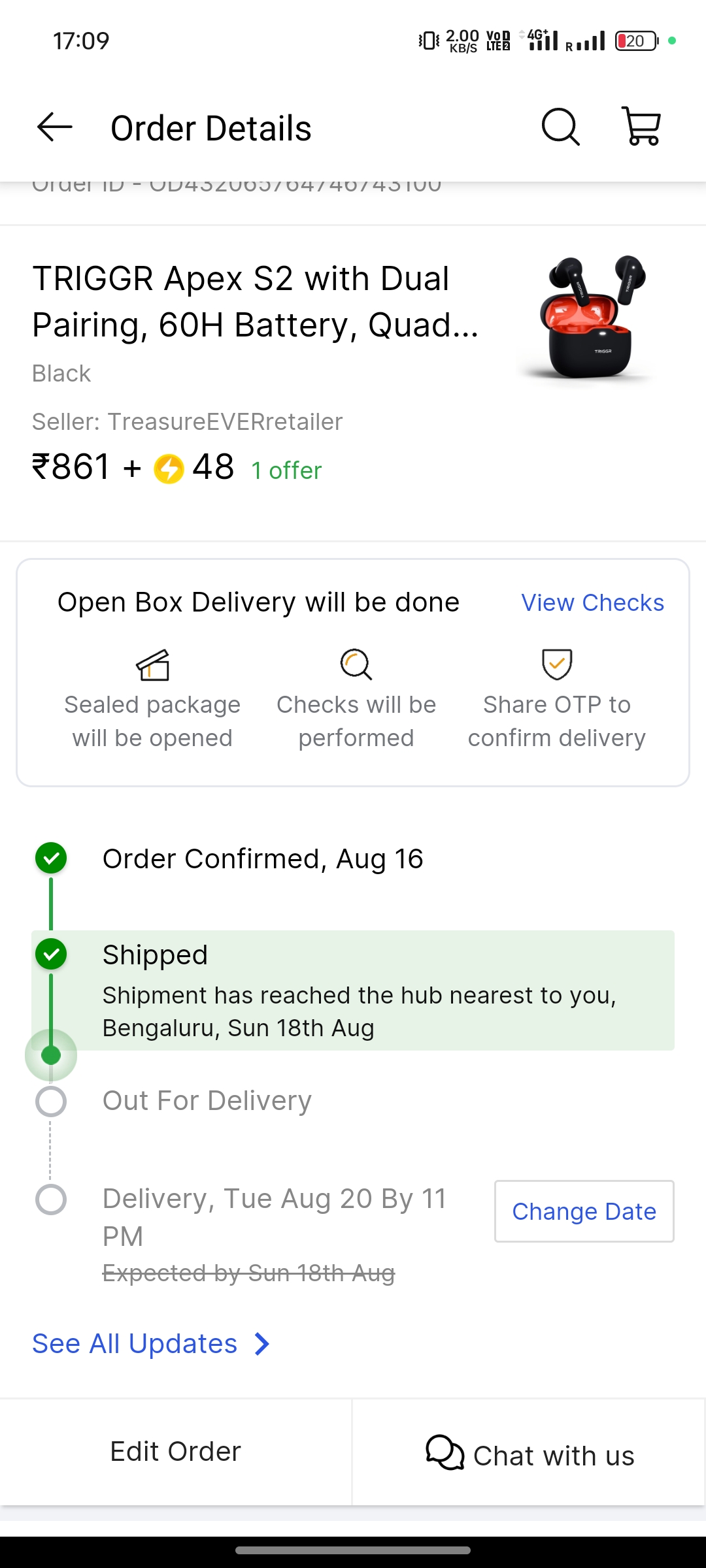 I ordered Triggr company earbuds from on August 16, 2024. They give time of delivery by August 18 but didn’t deliver and extended delivery date to August 20. But again they gave me extended date to August 21. Even by 21 they didn’t deliver it.
