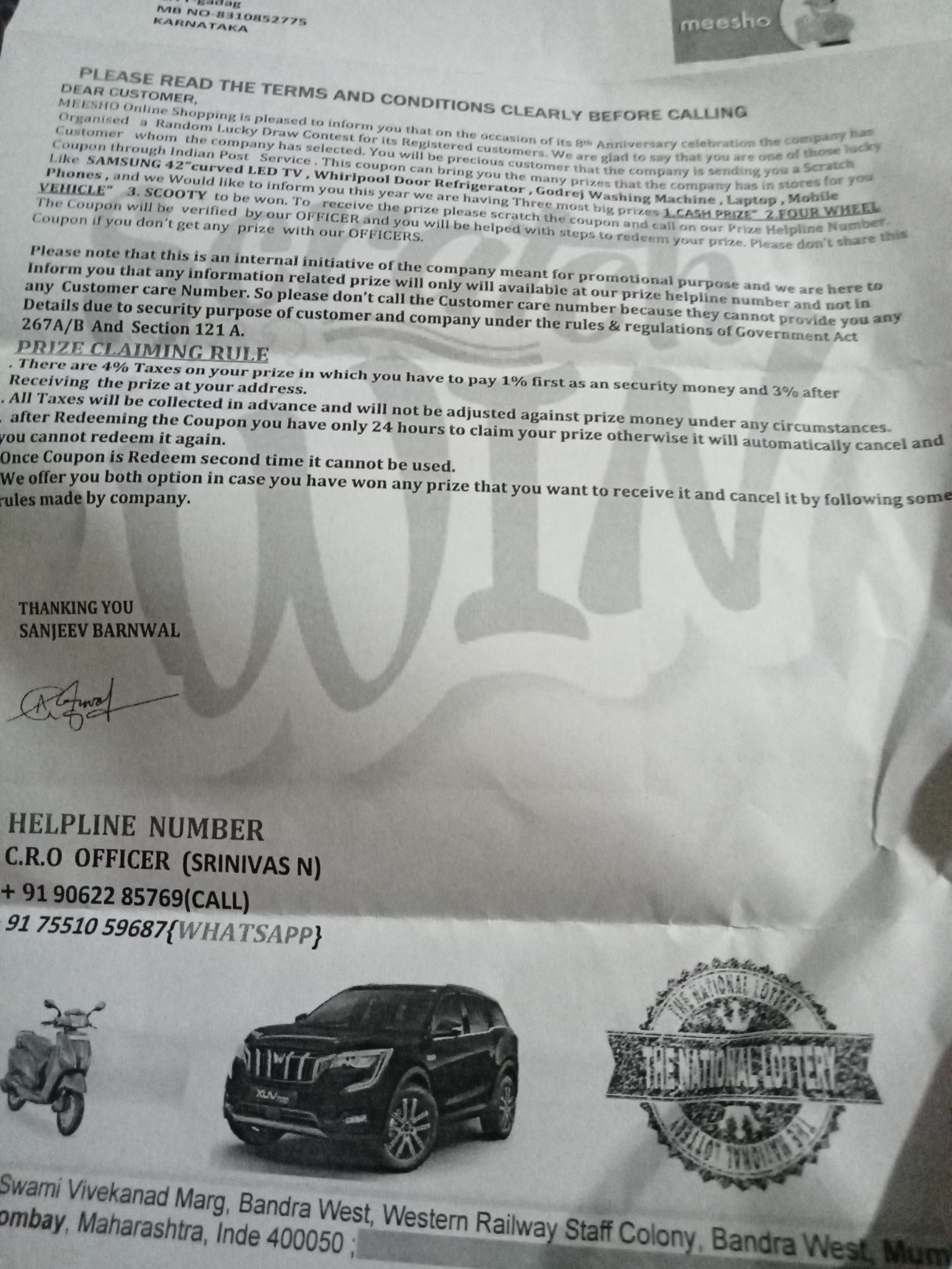 Hello Sangeeta, please be informed that the reward shared is not from Meesho. We would like to let you know that Meesho doesn’t run any lucky draws or offline events like that. Moreover, we don’t ask for any such information like CVV or OTP. We request you to please refrain yourself from getting into or considering these kind of frauds in the name of Meesho.