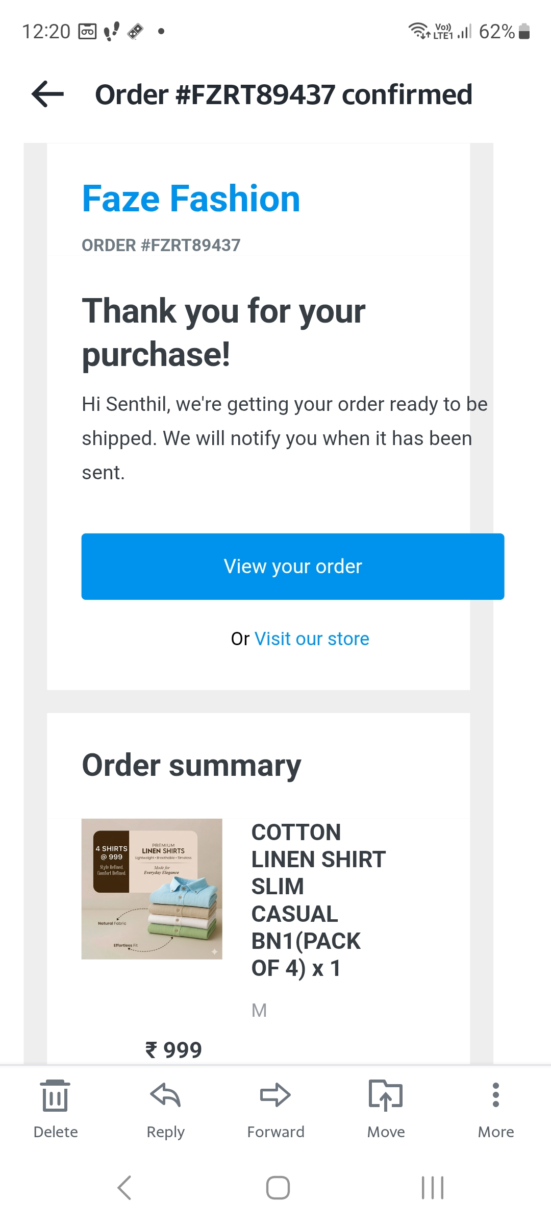Online Lilen shirt ordered. At the time of order it was showing 4 no of Lilen shirt size M of Rs. 999/- and subsequently I have ordered on COD basis. My order no : FZRT89437. I have received a message from Ekart tracking ID PGRC6000109113 and the Parcel delivered on 26.02.2026.
