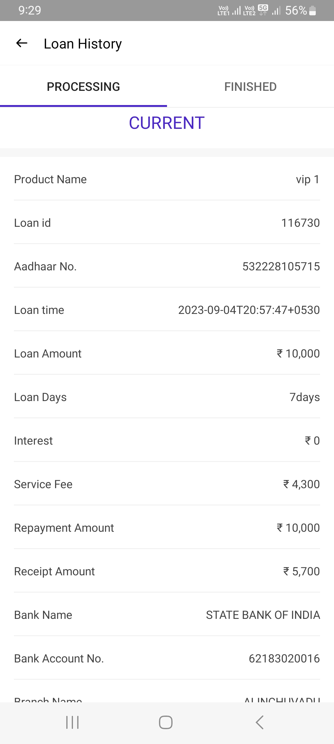 I have apply online loan on cash more app, they aproved my loan of 10000, amount is 5700 in credit account, balance 4300 processing fee, but amount still not credited in my account