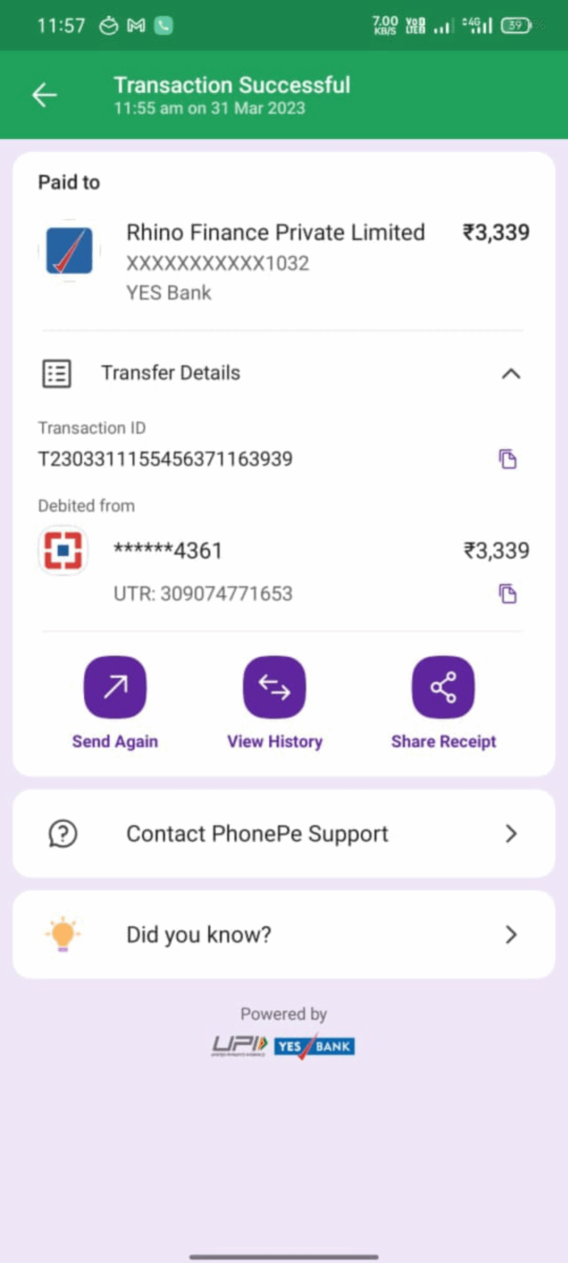 I took a loan (A1007PENMD7D) from rhino finance in 2019 of amount sum of 3000 and I already closed the account by paying amount of 3339 in 2023 on March but the account still showing in .y cibil