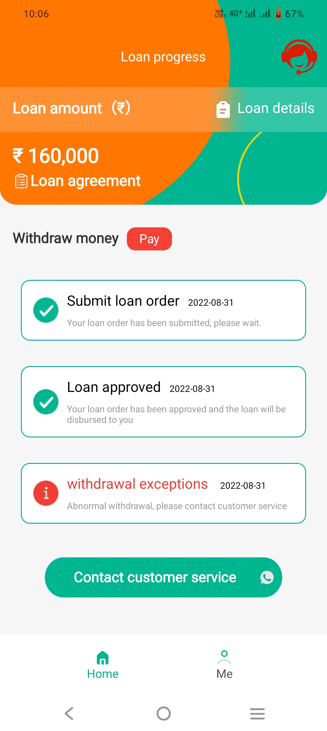 I was looking for personal loan of 160000. For withdrawing money it is asking to pay. And in app it is showing abnormal withdrawal while amount not even credited in the account. And it is asking to contact customer care.