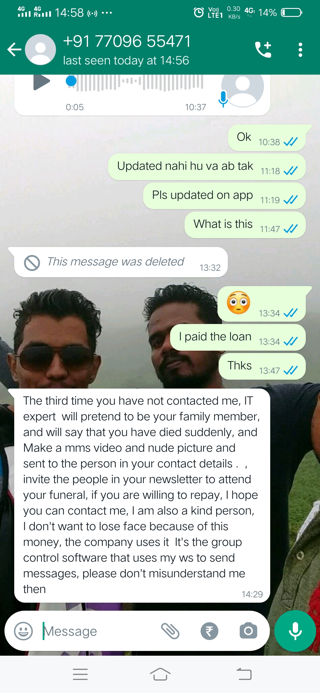 For my emergency purpose .i took a loan fish cash loan application now available in Google Play Store also i take 3559 loan amt and due date is 22/04/2022, but the fish cash customer executive person mag me through WhatsApp number one day before but i paid loan one day ,but now they harassing your loan was not updated and repay again