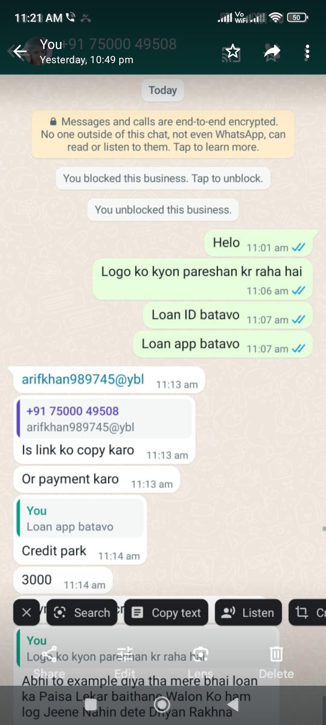 Sir, I took a loan of Rs 60,000 from Navi app on 22nd EMI. who was 14 months old. But after a while there were two transactions of Rs 1800,1800 in my account. When I did not apply for the loan of this amount. Suddenly after 7 days I became ill. The person called and said that he has taken a loan of Rs 6000 from Swift and Credit Park. And he send personal UPI ID arifkhan989745@ybl .After making your payment, I will call you on 500 contact number and send you your nude video and picture on WhatsApp.