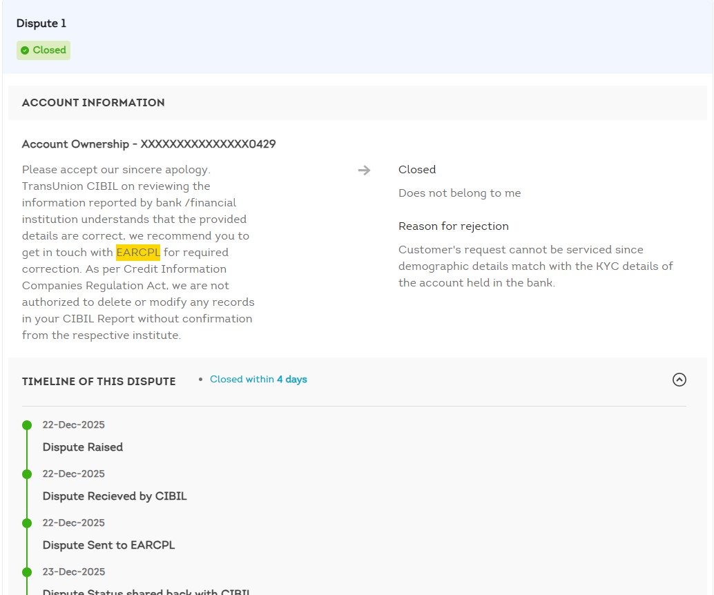 I raised a formal dispute with TransUnion CIBIL; however, the dispute was closed on the grounds that demographic/KYC details matched, without providing any documentary proof or loan records. The concerned lender has also failed to provide copies of the loan application, signed agreement, or KYC documents allegedly used to create this loan account.