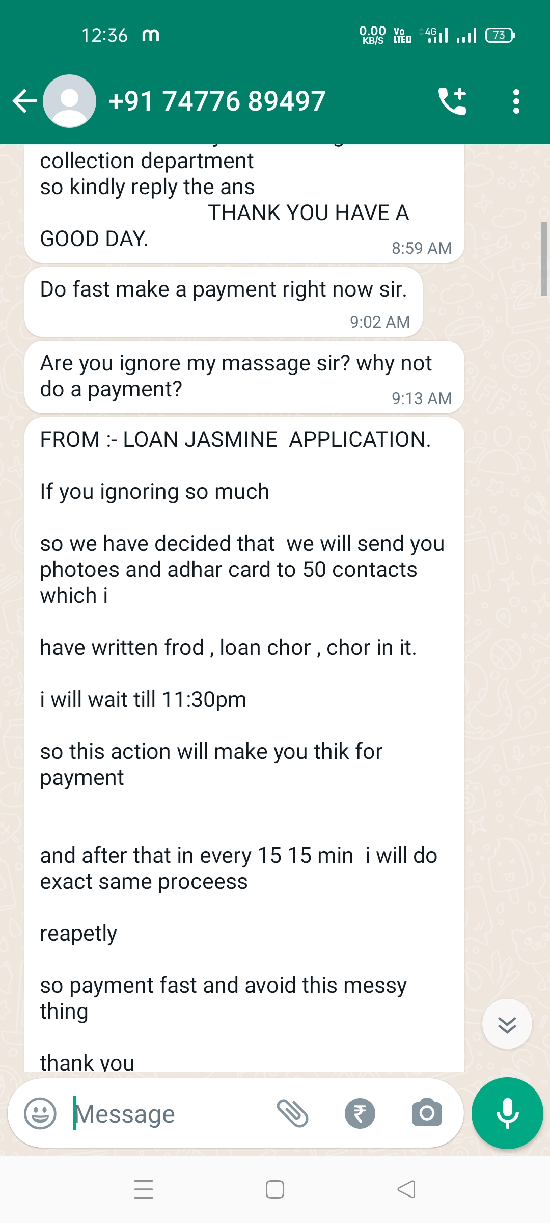 I got an sms mentioning approved personal loan, I just go through that link and install their app, app name LOAN JASMINE it is in playstore, after installation I given my kyc and bank details and they said 6000 rs approved, but after sometime amount credited to my account without any confirmation mentioning emi tenure or anything, after that I checked the bank account only Rs.3200 is credited and Rs. 2800 they took as all charges and interest for 6 days. Loan need to repaid within 6 days I get shocked after viewing this suddenly I closed the loan by repaying it through their app by sending money to upi id they mentioned, and uninstalled the app. But today they messaged me and harassed to repay the amount I told them that I already paid money and showed the screenshot of payment. But they are saying that is not repaid and repay once more otherwise misuse kyc details and send message to my contacts as I am a fraud these messages are sent through whatsapp. So I send them a detail message that I am going to complaint this and we can make it legally. Kindly resolve this I have all proofs of payment and I need to remove that app from playstore because I donot want anyone to get cheated and harassed like this and also loss of money too. I am attaching the screenshot of chat.
