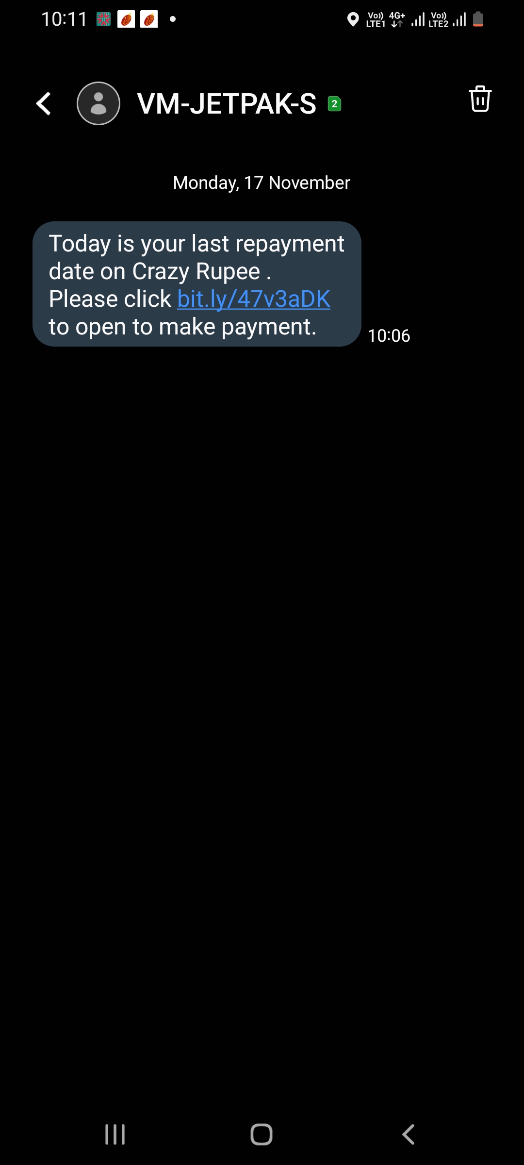 I haven’t taken any loan from crazy rupee. But today I got a msg from a number and today is the last day for the repayment. I am hereby lodge a complaint in forum .please take an immediate action.