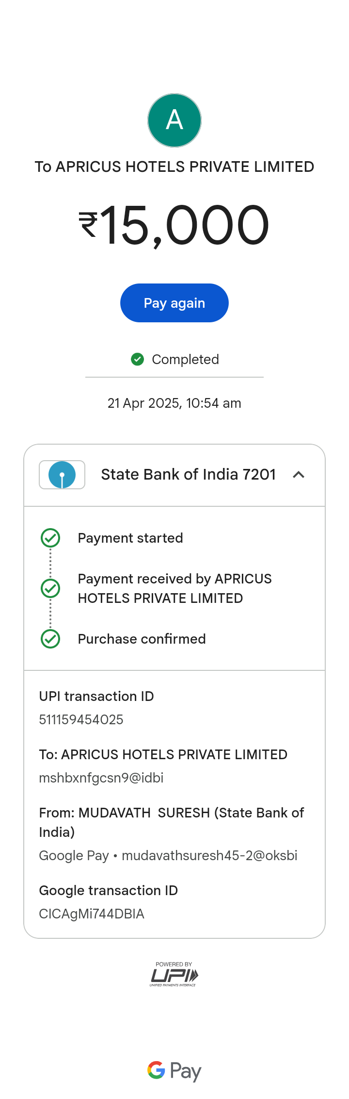 Paid to : APRICUS HOTELS PRIVATE LIMITED