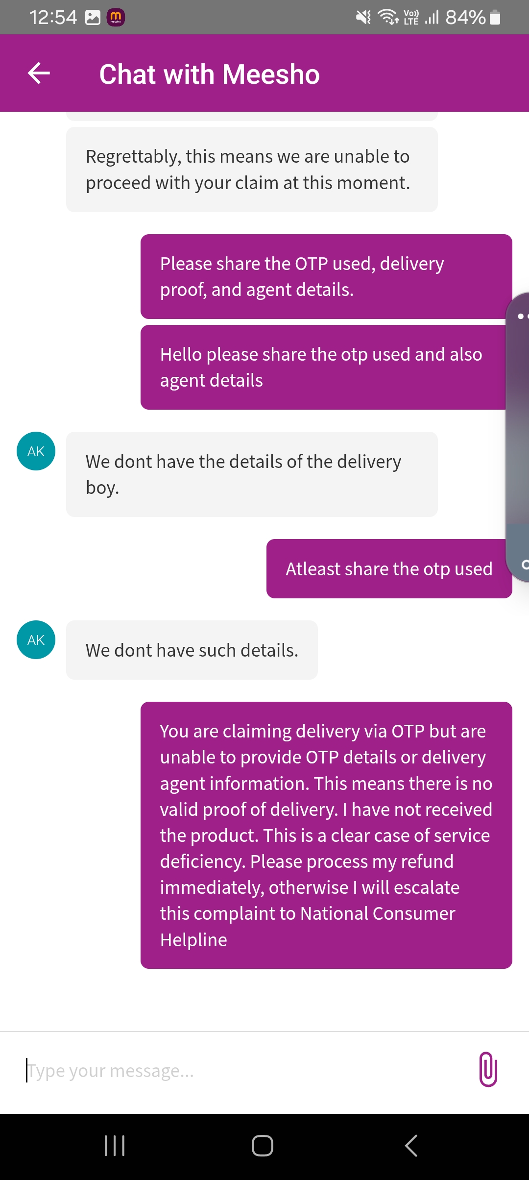 I recently ordered two products on Meesho.I did not received the products. Prepaid order marked delivered via OTP, but I did not receive any OTP or product. The company is unable to provide OTP details or delivery agent information, which proves no valid delivery happened. Despite this, they are refusing refund. This is a clear case of fraudulent delivery and deficiency in service. I request immediate refund