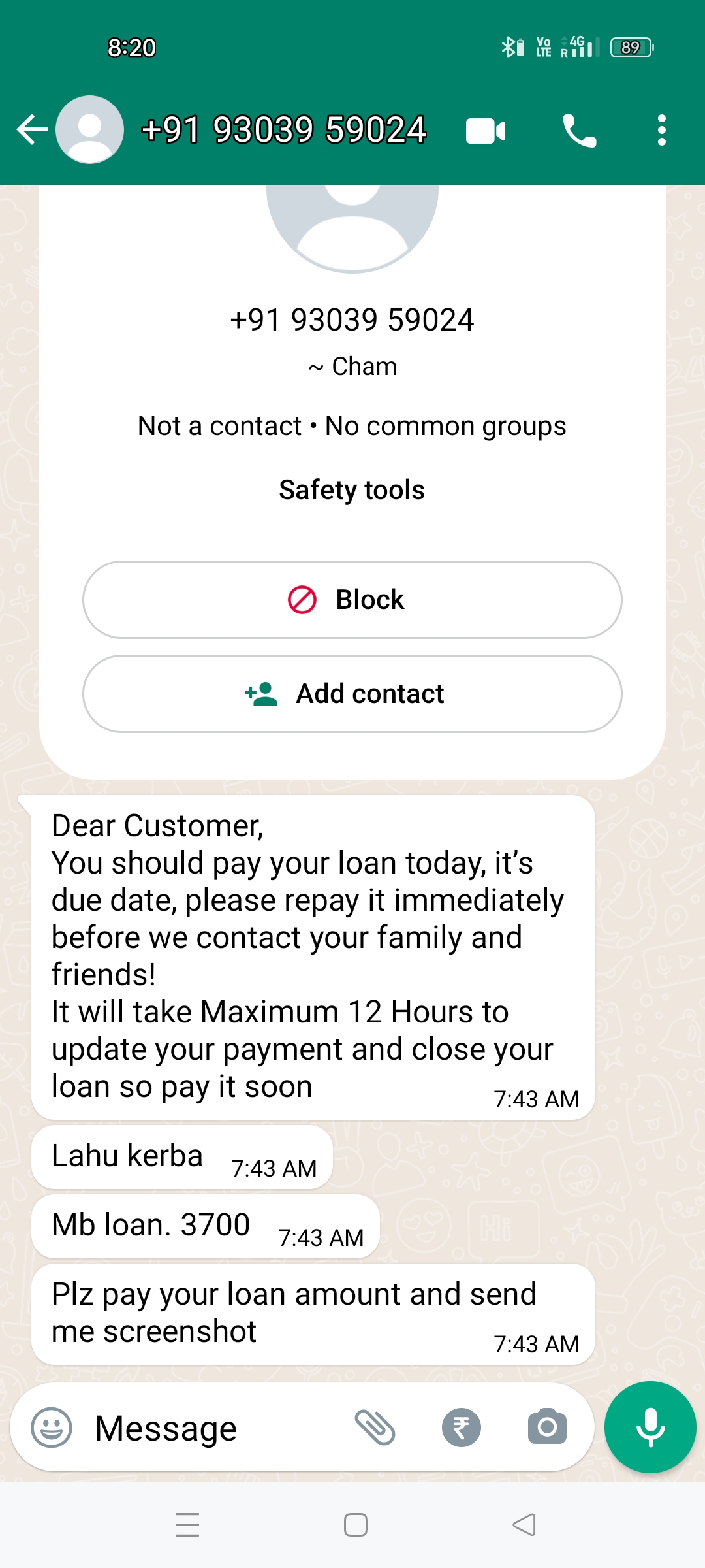 By my mistake apply the loan money credit in my account.i contact customer care number MB loan not available but I am not getting loan but they give automatically Rs 2200 and asking now 3700 how is possible,number message to pay the loan asking for me. My contact share my picture send to threat me using bad language and blackmailing.please solve this