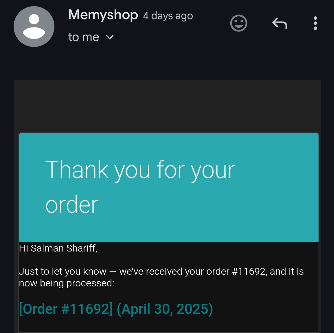 I have ordered a product from memyshop on April 30 amount of Rs. 999 was debited from my account and I receive mail from the site for successful order. Screenshot of the mail received is attached herewith. But till now I have not received any order. Even I am not able to track my order