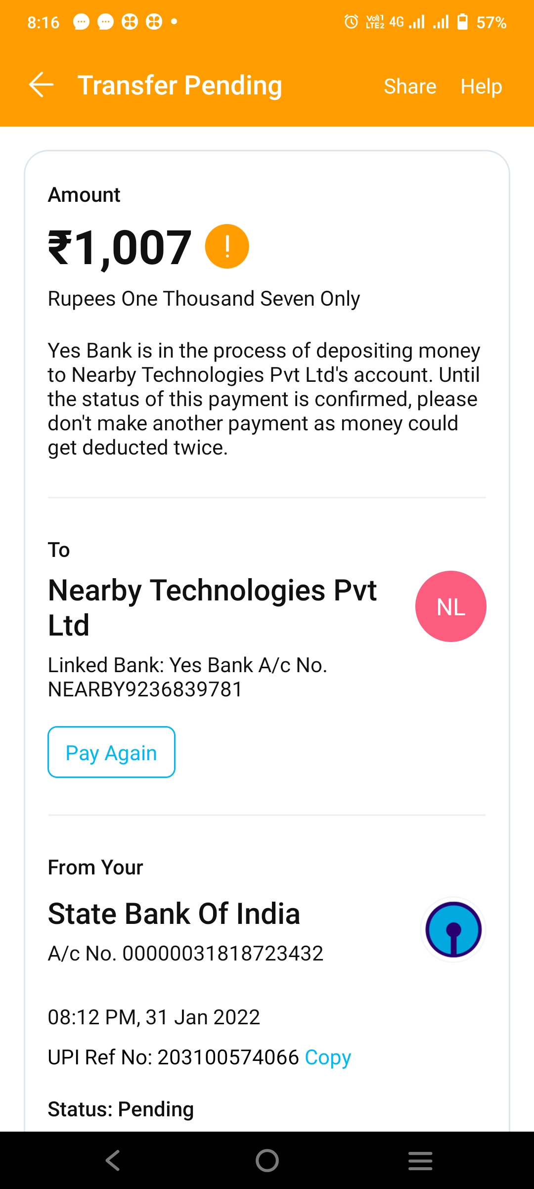 Maine Paytm UPI se paisa transfer kiya tha paynearby me 31/1/22 ko lekin mera paisa mujhe nhi mila