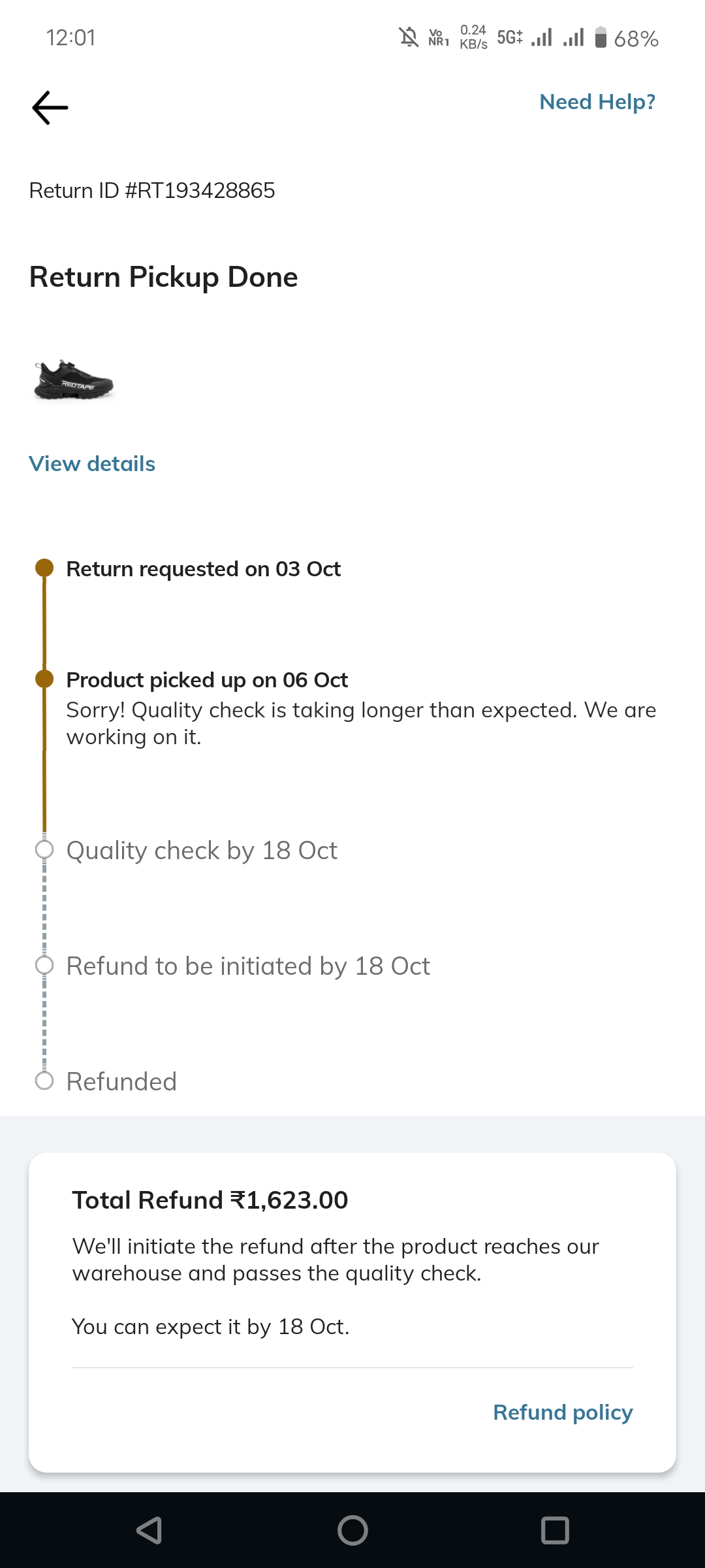 Mujhe different product mila tha or mene return kra 6 October ko pickup complete hogaya ajj inhone 18 October ko promise date kaha tha refund apko 18 tarik ko mil jayega pr mujhe refund nahi diya 13 din tak already me ruka hua hu ab bol rahe ye log quality check longer ajio app hai mujhe mera refund dila do