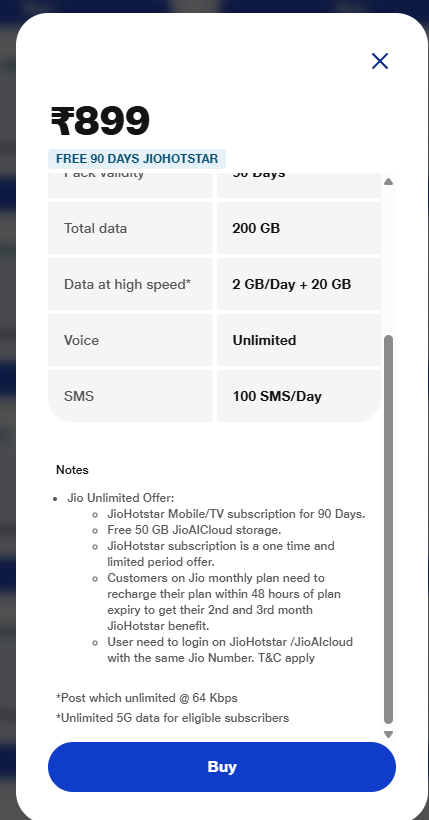 I recharged my Jio number with ₹859, which explicitly mentions that it includes a 90-day subscription to Disney+ Hotstar for both Mobile and TV access. Clearly Stated in the screenshot i provided.