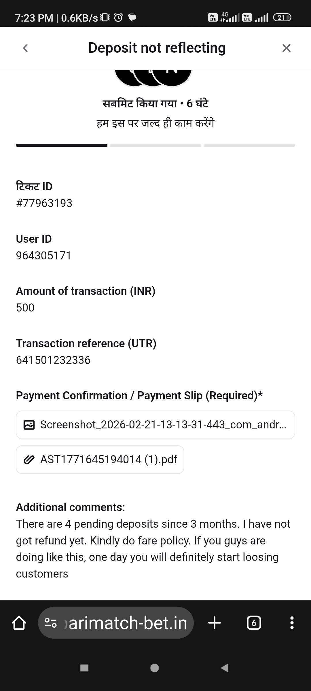 Hello sir, i made multiple deposits on parimatch app from my Amazon pay wallet. which were not credited to my parimatch account. Amounts are – 500 on 5th Jan 26 (UTR-600588800625), 200 on 7th Jan 26 (UTR- 600789261177), 300 on 16th dec 25 (UTR- 535083265303) and 500 on 17th Jan 26 (UTR-601792215864). Despite multiple attempts to resolve this through their official support channels, the merchant has provided no timeline for resolution.