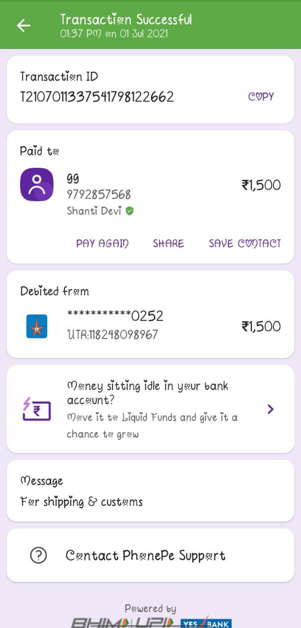 I buy a ph from meenu customs electronics. I pay 4500 rupees by phonepay. They not send me the order details. He cheated me. I want my money back. Plz help me.