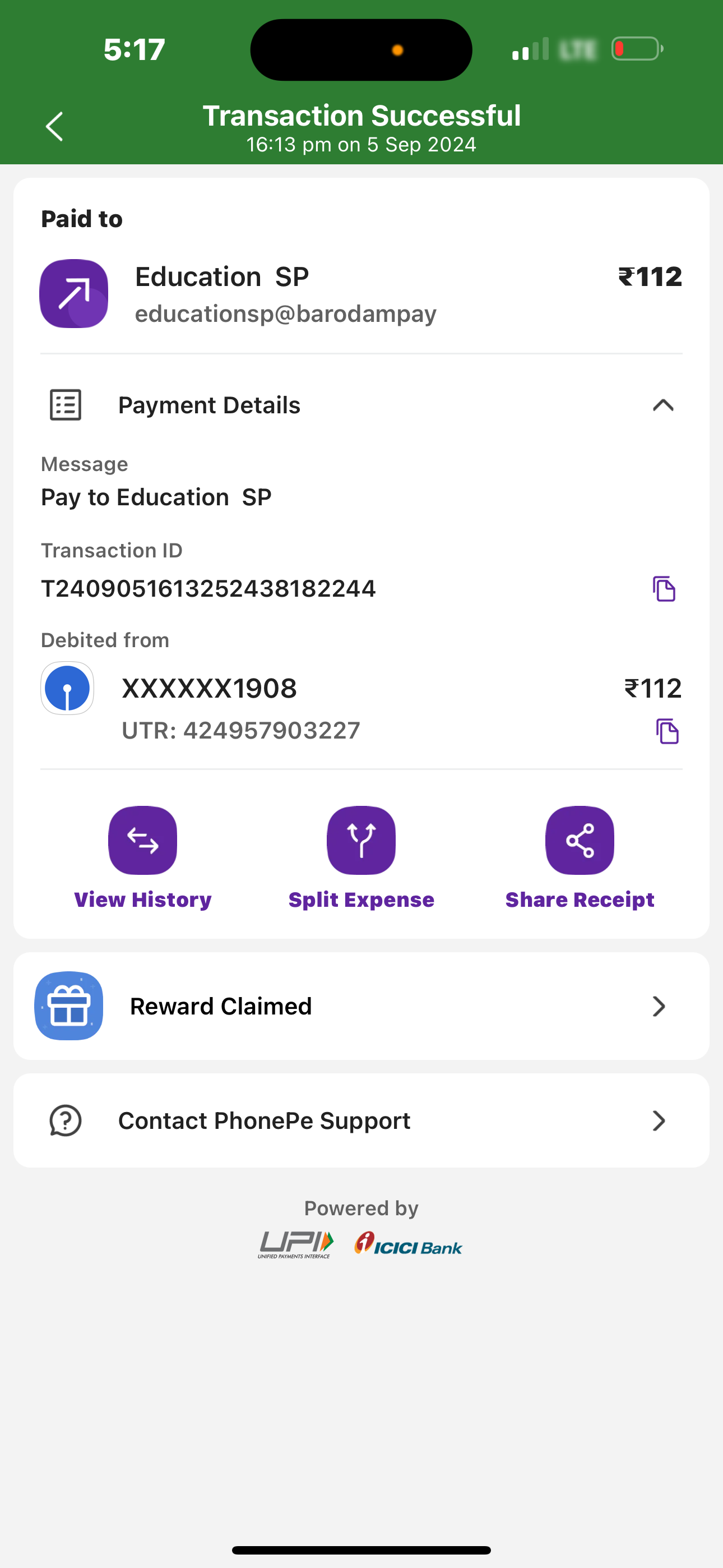 I submitted exam fees by using phone pay today on 05/09/2024 to Baroda E Gateway( educationsp@barodampay) IPG 101202424983509849 Education SP. Fees deducted 112₹ by my account but it is still showing not paid so please refund my money. candidate name – neha kashyap UPI transaction ID – T2409051613252438182244