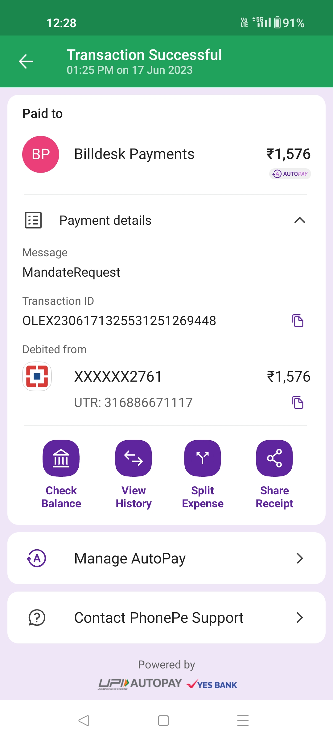 Money deducted automatically through phone pay twice in June & July and I haven’t authorised both the payments(1576 +1576)