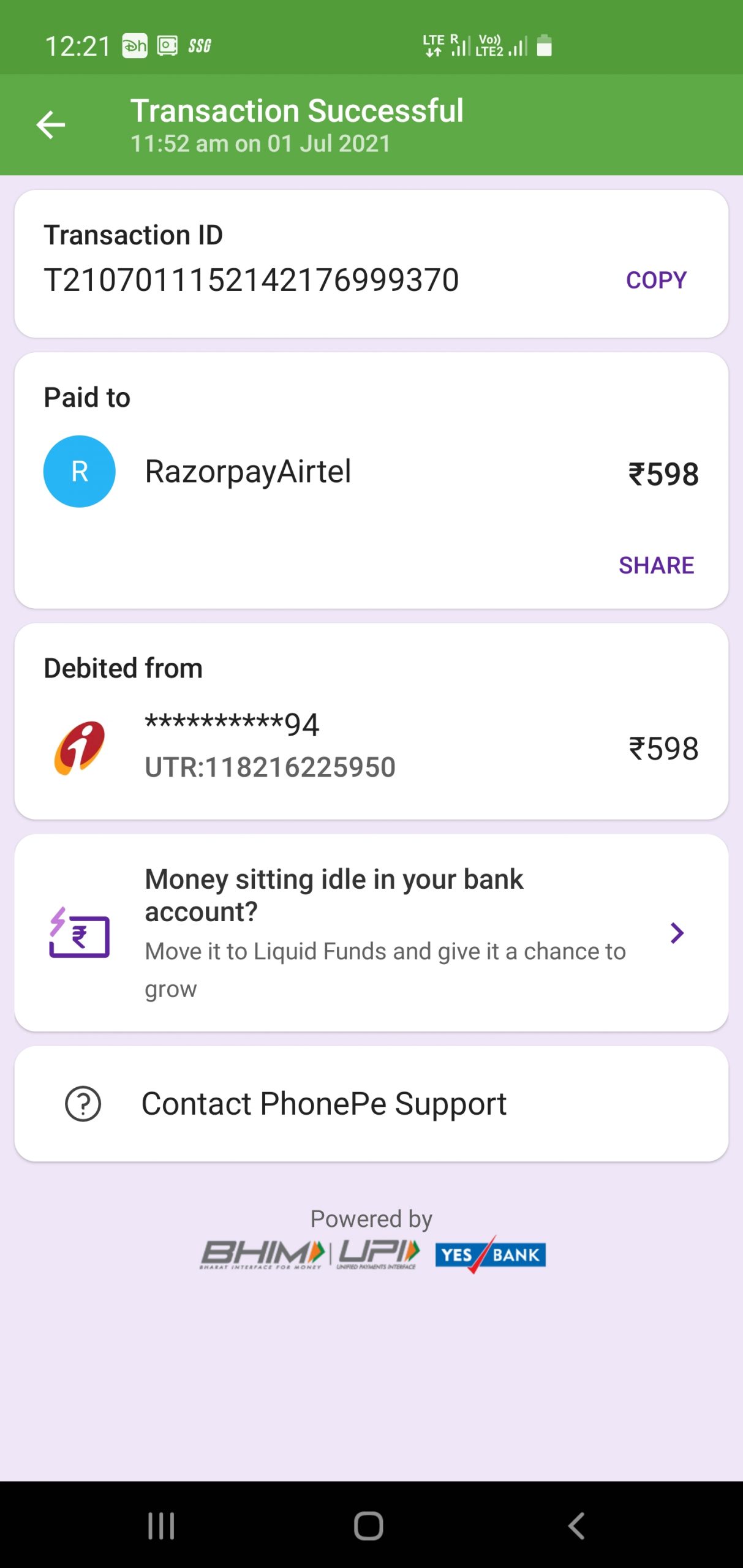 Today I have recharged my prepaid airtel mobile number 9643269829 with 598rupees through phone pe app and transaction was done successfully but recharge not done yet. Kindly recharge my number or else return the money which you took