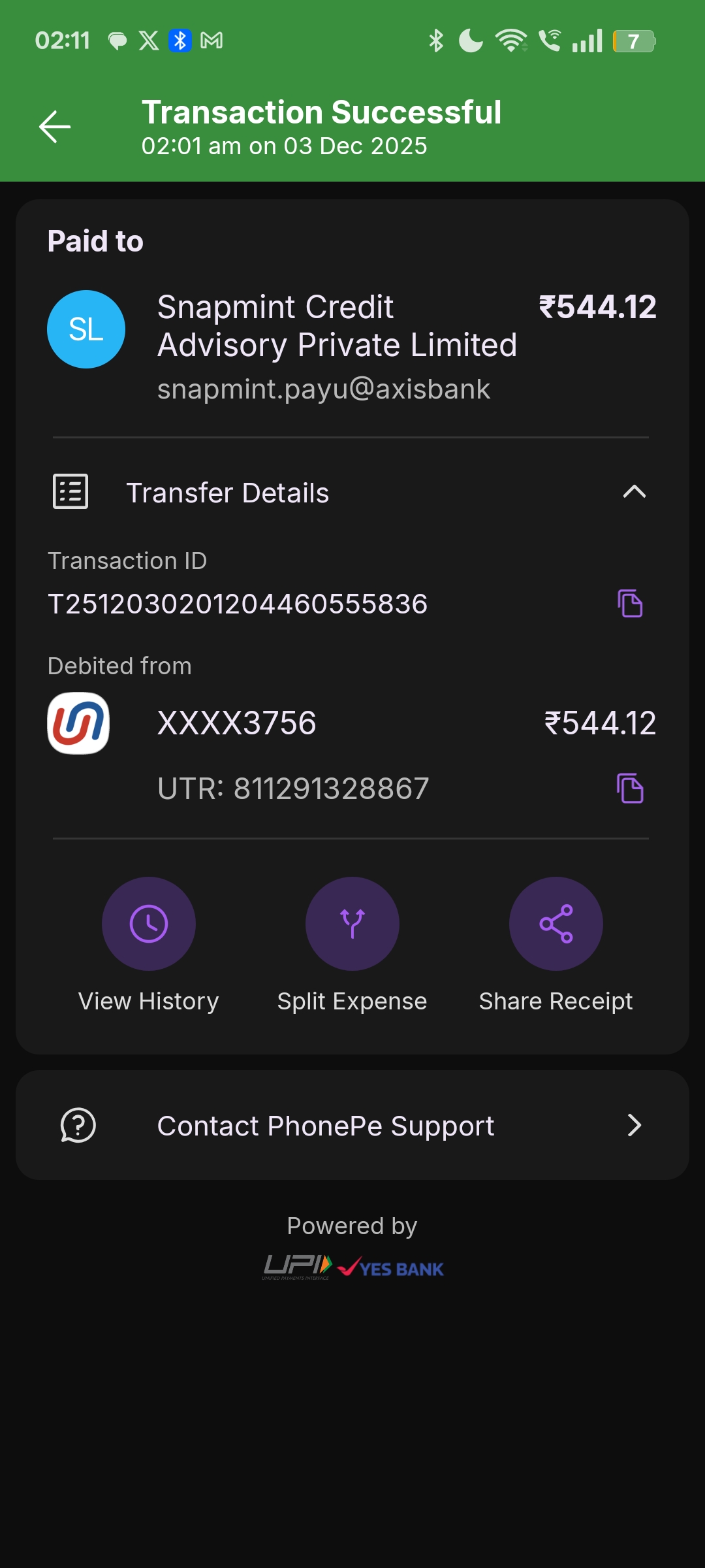 I made a successful payment of ₹544.12 on 3rd December 2025 at 02:01 AM through PhonePe/UPI.
