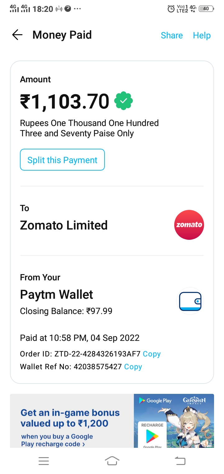 I am Vipin Kumar Gupta. Date 4/09/2022 10:58 Pm 1103.70/Rs deducted my paytm wallet to Zomato without any order.
