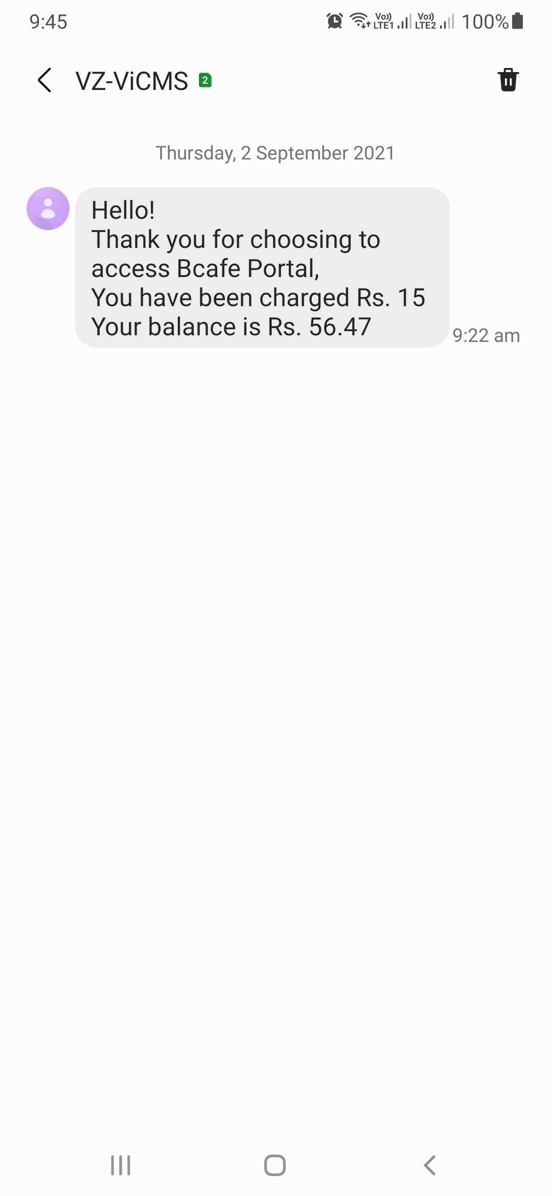Today morning on 2nd of September I received a message about deduction of rupee 15 from my sim account of vi by bcafe portal without my permission.