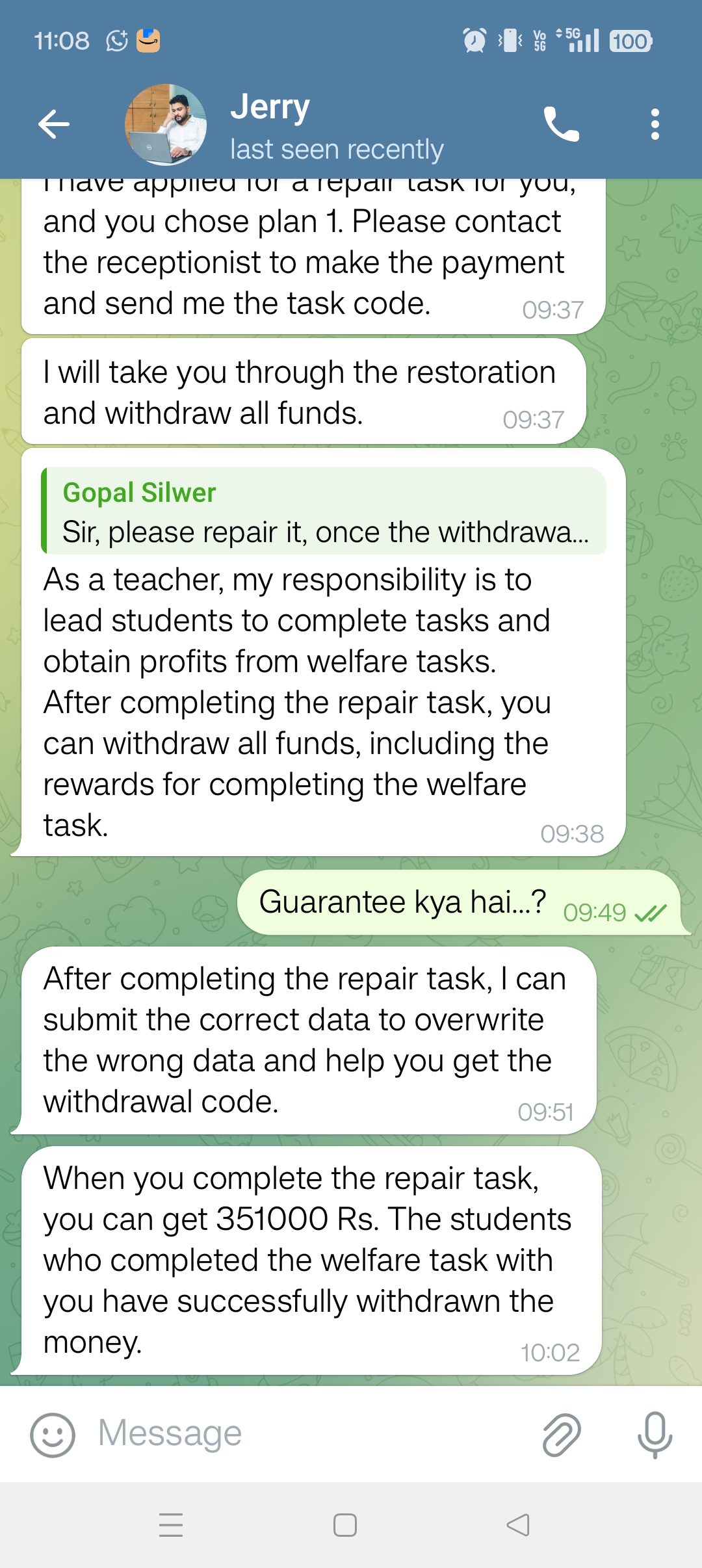 Sir pahile what’s app pe es number se ( +91 63079 76458) message aata hai ki aap google map se din ka 5k se 8k tak kama sakte hai toh maine unki baat maanli aur unhone kuch hotels ki link bheji aur kaha link main jao aur us hotels ko star aur review dedo aapka work payment aapko mil jayega aur waise huva bhi next day aur ek link bheja aur telegram pe ek advise dene vali ka link diya usne kuch task bola aur main karta gaya start main 800 pe 2000 milela bole mila fir 2000 pe 5000 bole mila fir aisa task lekar aaye samaj main nahi aaya ki ab fraud ho sakta hai pahile 2000 bole bhare fir usi task main 2nd task 20000 bharo Maine bhara fir usi task main 3rd task 65000 bharo aur main pagal bhar diya aur fir bolte hai ki kuch gadbadi ho gayi hai ese repair karna padega to maine bola kar do repair, fir usne repair ke liye 150,000/- ab tension start huva maine bola sir etna paise toh mere paas nahi hai toh vo bol rahe hai ki task to complete karna padega, agar 150,000/- amount aap bharte Ho to aapko 351,000/- milega lekin mere paas to ab futi kavdi bhi. Nahi hai salo ne loot liya😔😔